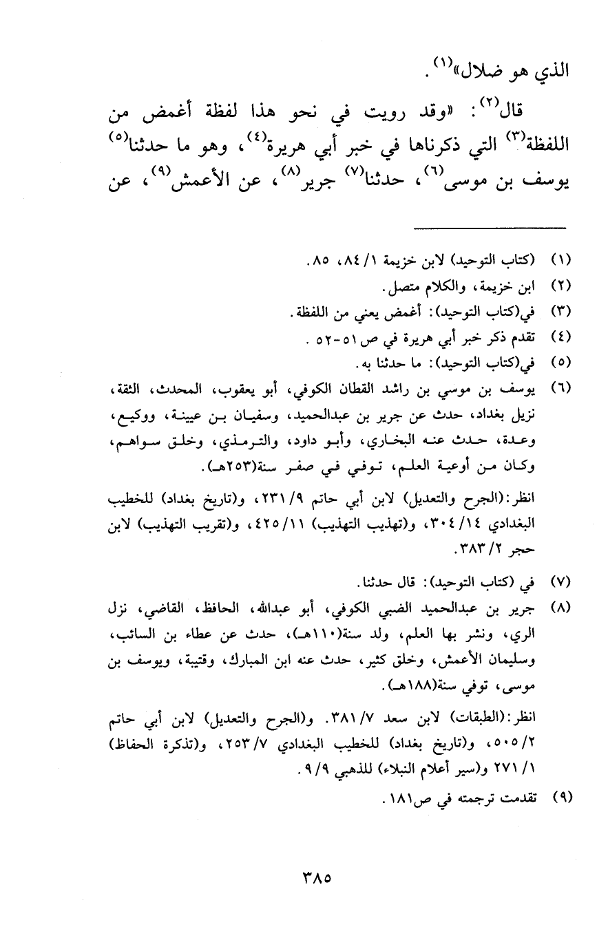 الذي هو ضلال قال وقد رويت في نحو هذا لفظة أغمض من اللفظة التي ذكرناها في خبر أبي هريرة وهو ما حدثنا يوسف بن موسى حدثنا جرير عن الأعمش عن
