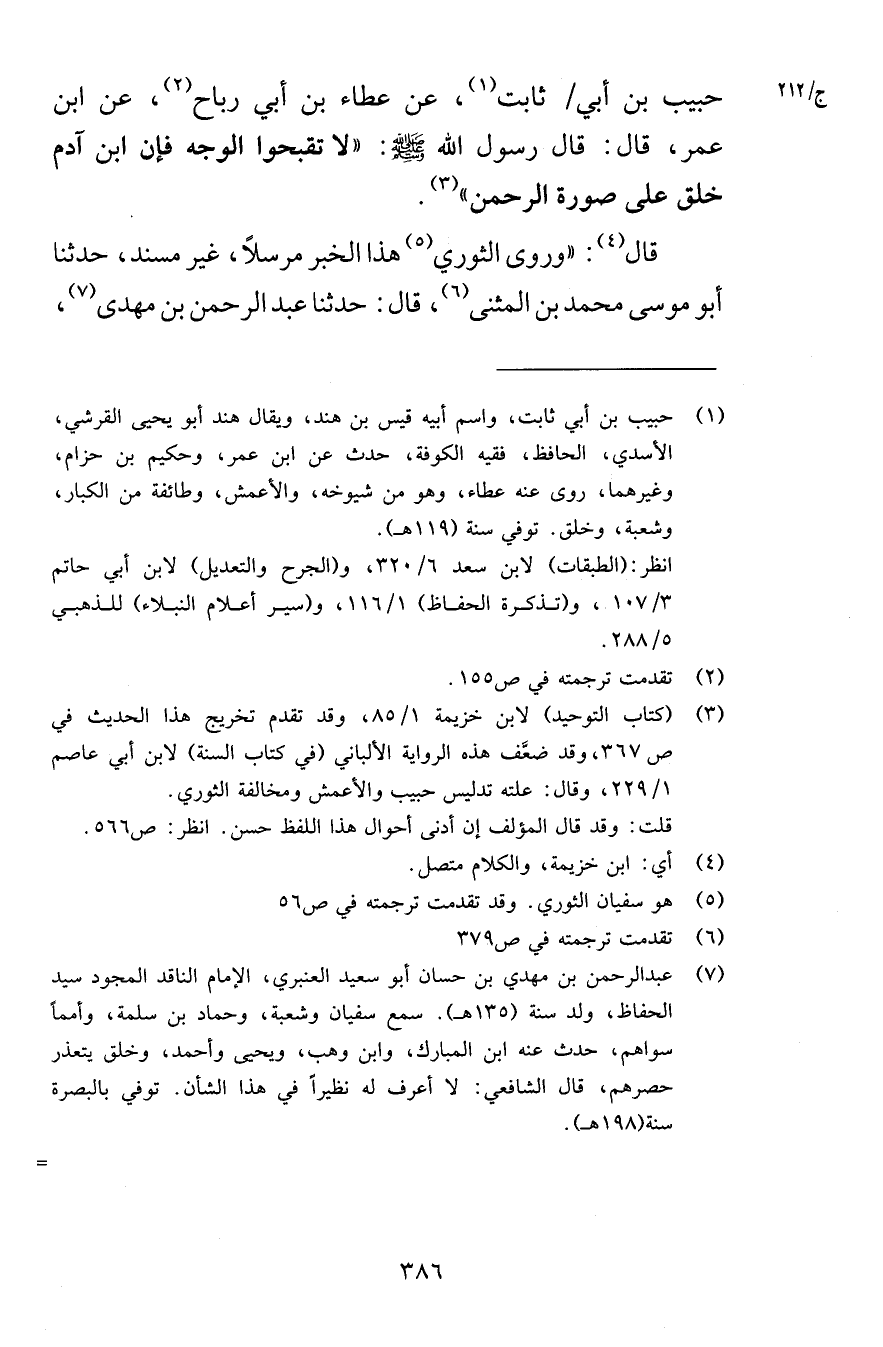 حبيب بن أبي ثابت عن عطاء بن أبي رباح عن ابن عمر قال قال رسول الله صلى الله عليه وسلم لا تقبحوا الوجه فإن ابن آدم خلق على صورة الرحمن قال وروى الثوري هذا الخبر مرسلاً غير مسند حدثنا أبو موسى محمد بن المثنى قال حدثنا عبد الرحمن بن مهدى