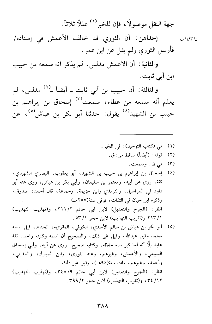 جهة النقل موصولاً فإن للخبر عللاً ثلاثاً إحداهن أن الثوري قد خالف الأعمش في إسناده فأرسل الثوري ولم يقل عن ابن عمر والثانية أن الأعمش مدلس لم يذكر أنه سمعه من حبيب ابن أبي ثابت والثالثة أن حبيب بن أبي ثابت أيضاً مدلس لم يعلم أنه سمعه من عطاء سمعت إسحاق بن إبراهيم بن حبيب بن الشهيد يقول حدثنا أبو بكر بن عياش عن