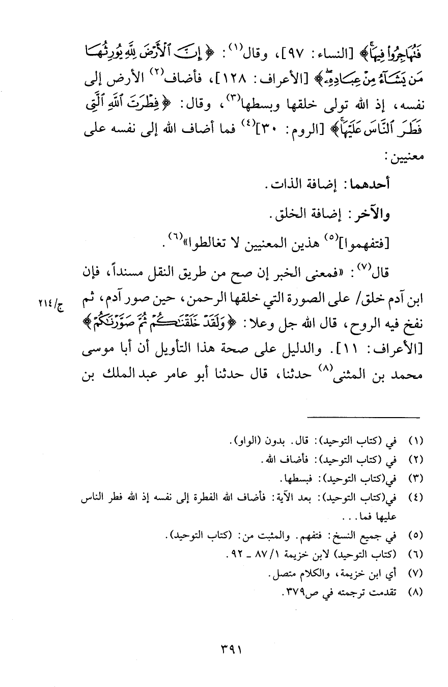 فَتُهَاجِرُوا فِيهَا [النساء 97] وقال إِنَّ الْأَرْضَ لِلَّهِ يُورِثُهَا مَنْ يَشَاءُ مِنْ عِبَادِهِ [الأعراف 128] فأضاف الأرض إلى نفسه إذ الله تولى خلقها وبسطها وقال فِطْرَتَ اللَّهِ الَّتِي فَطَرَ النَّاسَ عَلَيْهَا [الروم 30] فما أضاف الله على نفسه على معنيين أحدهما إضافة الذات والآخر إضافة الخلق فتفهموا هذين المعنيين لا تغالطوا قال فمعنى الخبر إن صح من طريق النقل مسنداً فإن ابن آدم خلق على الصورة التي خلقها الرحمن حين صور آدم ثم نفخ فيه الروح قال الله جل وعلا وَلَقَدْ خَلَقْنَاكُمْ ثُمَّ صَوَّرْنَاكُمْ [الأعراف 11] والدليل على صحة هذا التأويل أن أبا موسى محمد بن المثنى حدثنا قال حدثنا أبو عامر عبد الملك بن