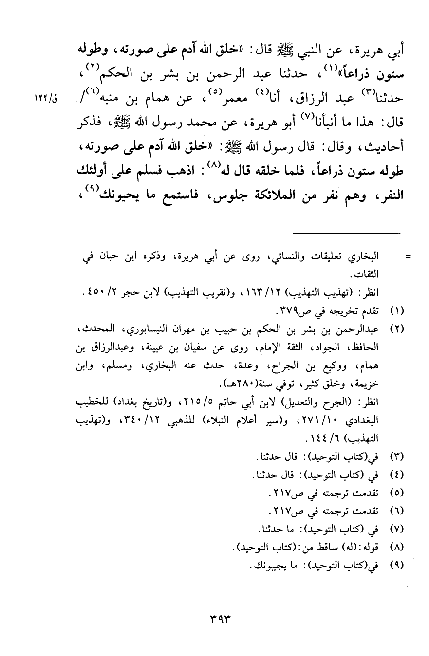 أبي هريرة عن النبي صلى الله عليه وسلم قال خلق الله آدم على صورته وطوله ستون ذراعاً حدثنا عبد الرحمن بن بشر بن الحكم حدثنا عبد الرزاق أنا معمر عن همام بن منبه قال هذا ما أنبأنا أبو هريرة عن محمد رسول الله صلى الله عليه وسلم فذكر أحاديث كثيرة وقال قال رسول الله صلى الله عليه وسلم خلق الله آدم على صورته طوله ستون ذراعاً فلما خلقه قال له اذهب فسلم على أولئك النفر وهم نفر من الملائكة جلوس فاستمع ما يحيونك