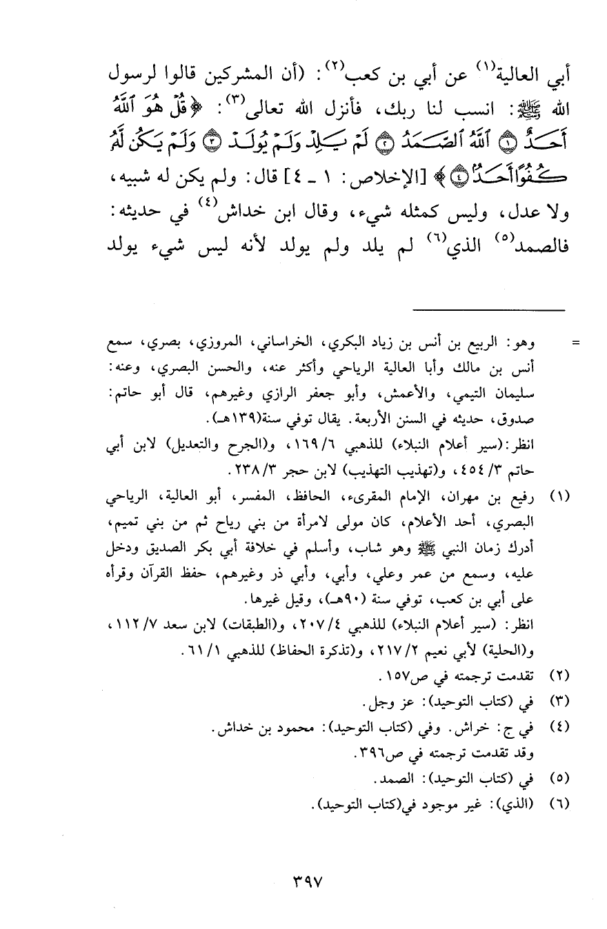 أبي العالية عن أبي بن كعب أن المشركين قالوا لرسول الله صلى الله عليه وسلم انسب لنا ربك فأنزل الله تعالى قُلْ هُوَ اللَّهُ أَحَدٌ (1) اللَّهُ الصَّمَدُ (2) لَمْ يَلِدْ وَلَمْ يُولَدْ (3) وَلَمْ يَكُنْ لَهُ كُفُوًا أَحَدٌ (4) [الإخلاص 1-4] قال ولم يكن له شبيه ولا عدل وليس كمثله شيء وقال ابن خداش في حديثه فالصمد الذي لم يلد ولم يولد لأنه ليس شيء يولد