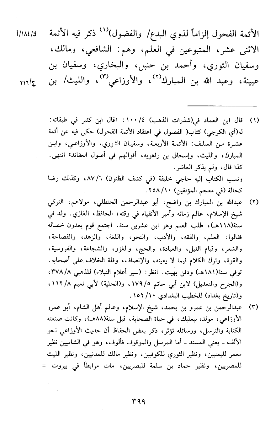 الأئمة الفحول إلزاماً لذوي البدع والفضول ذكر فيه الأئمة الاثنى عشر المتبوعين في العلم وهم الشافعي ومالك وسفيان الثوري وأحمد بن حنبل والبخاري وسفيان بن عيينة وعبد الله بن المبارك والأوزاعي والليث بن