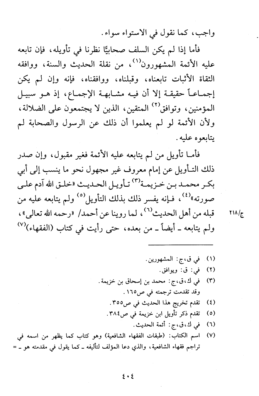 واجب كما نقول في الاستواء سواء فأما إذا لم يكن السلف صحابيًّا نظرنا في تأويله فإن تابعه عليه الأئمة المشهورون من نقله الحديث والسنة ووافقه الثقاة الأثبات تابعناه وقبلناه ووافقناه فإنه وإن لم يكن إجماعاً حقيقة إلا أن فيه مشابهة الإجماع إذ هو سبيل المؤمنين وتوافق المتفقين الذين لا يجتمعون على الضلالة ولأن الأئمة لو لم يعلموا أن ذلك عن الرسول والصحابة لم يتابعوه عليه فأما تأويل من لم يتابعه عليه الأئمة فغير مقبول وإن صدر ذلك التأويل عن إمام معروف غير مجهول نحو ما ينسب إلى أبي بكر محمد بن خزيمة تأويل الحديث خلق الله آدم على صورته فإنه يفسر ذلك بذلك التأويل ولم يتابعه عليه من قبله من أهل الحديث لما روينا عن أحمد رحمه الله تعالى ولم يتابعه أيضاً من بعده حتى رأيت في كتاب الفقهاء