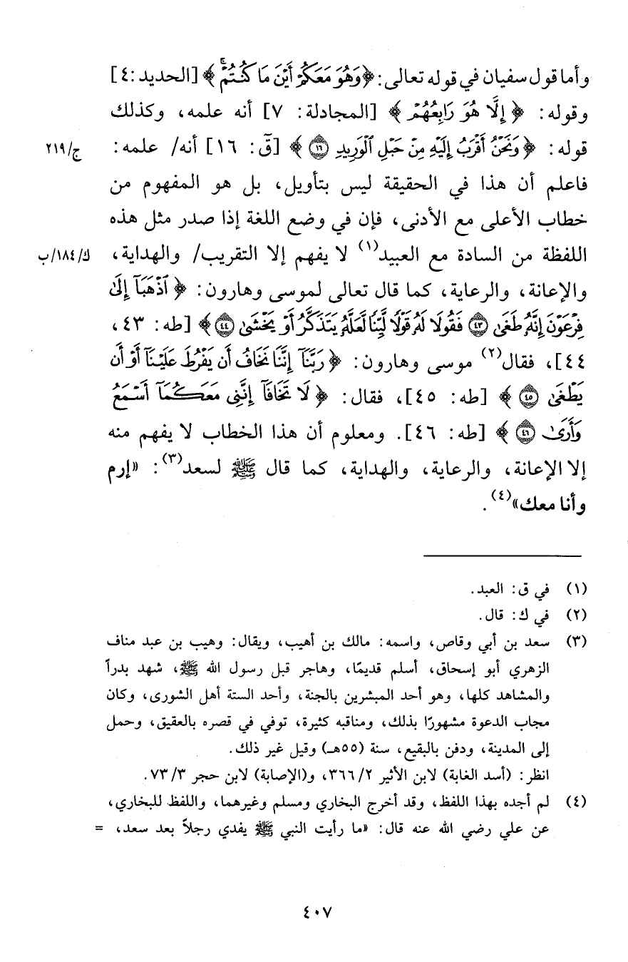 وأما قول سفيان في قوله تعالى وَهُوَ مَعَكُمْ أَيْنَ مَا كُنْتُمْ [الحديد 4] وقوله إِلَّا هُوَ رَابِعُهُمْ [المجادلة 7] أنه علمه وكذلك قوله وَنَحْنُ أَقْرَبُ إِلَيْهِ مِنْ حَبْلِ الْوَرِيدِ (16) [ق 16] أنه علمه فاعلم أن هذا في الحقيقة ليس بتأويل بل هو المفهوم من خطاب الأعلى مع الأدنى فإن في وضع اللغة إذا صدر مثل هذه اللفظة من السادة مع العبيد لا يفهم إلا التقريب والهداية والإعانة والرعاية كما قال تعالى لموسى وهارون اذْهَبَا إِلَى فِرْعَوْنَ إِنَّهُ طَغَى (43) فَقُولَا لَهُ قَوْلًا لَيِّنًا لَعَلَّهُ يَتَذَكَّرُ أَوْ يَخْشَى (44) [طه 43-44] فقال موسى لهارون رَبَّنَا إِنَّنَا نَخَافُ أَنْ يَفْرُطَ عَلَيْنَا أَوْ أَنْ يَطْغَى (45) [طه 45] فقال لَا تَخَافَا إِنَّنِي مَعَكُمَا أَسْمَعُ وَأَرَى (46) [طه 46] ومعلوم أن هذا الخطاب لا يفهم منه إلا الإعانة والرعاية والهداية كما قال صلى الله عليه وسلم لسعد إرم وأنا معك