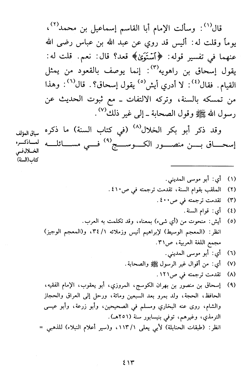 قال وسألت الإمام أبا القاسم إسماعيل بن محمد يوماً وقلت له أليس قد روي عن عبد الله بن عباس رضي الله عنهما في تفسير قوله اسْتَوَى قعد قال نعم قلت له يقول إسحاق بن راهوية إنما يوصف بالقعود من يمثل القيام فقال لا أدري أيش يقول إسحاق قال وهذا من تمسكه بالسنة وتركه الالتفات مع ثبوت الحديث عن رسول الله صلى الله عليه وسلم وقول الصحابة إلى غير ذلك وقد ذكر أبو بكر الخلال في كتاب السنة ما ذكره إسحاق بن منصور الكوسج في مسائله