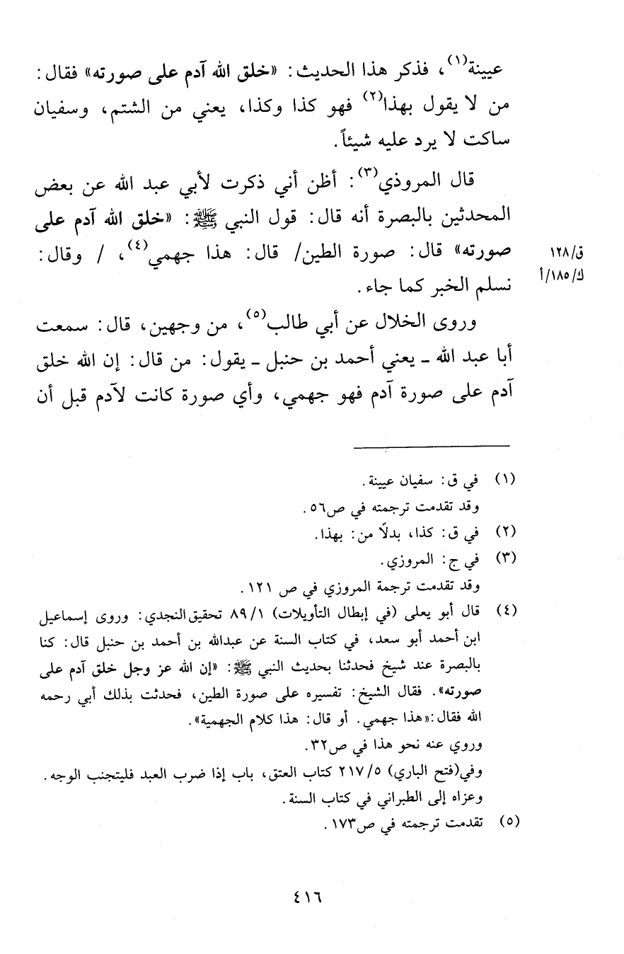 عيينة فذكر هذا الحديث خلق الله آدم على صورته فقال من لا يقول بهذا فهو كذا وكذا يعني من الشتم وسفيان ساكت لا يرد عليه شيئاً قال المروذي أظن، ي ذكرت لأبي عبد الله عن بعض المحدثين بالبصرة أنه قال قول النبي صلى الله عليه وسلم خلق الله آدم على صورته قال صورة الطين قال هذا جهمي وقال نسلم الخبر كما جاء وروى الخلال عن أبي طالب من وجهين قال سمعت أبا عبد الله يعني أحمد بن حنبل يقول من قال إن الله خلق آدم على صورة آدم فهو جهمي وأي صورة كانت لآدم قبل أن
