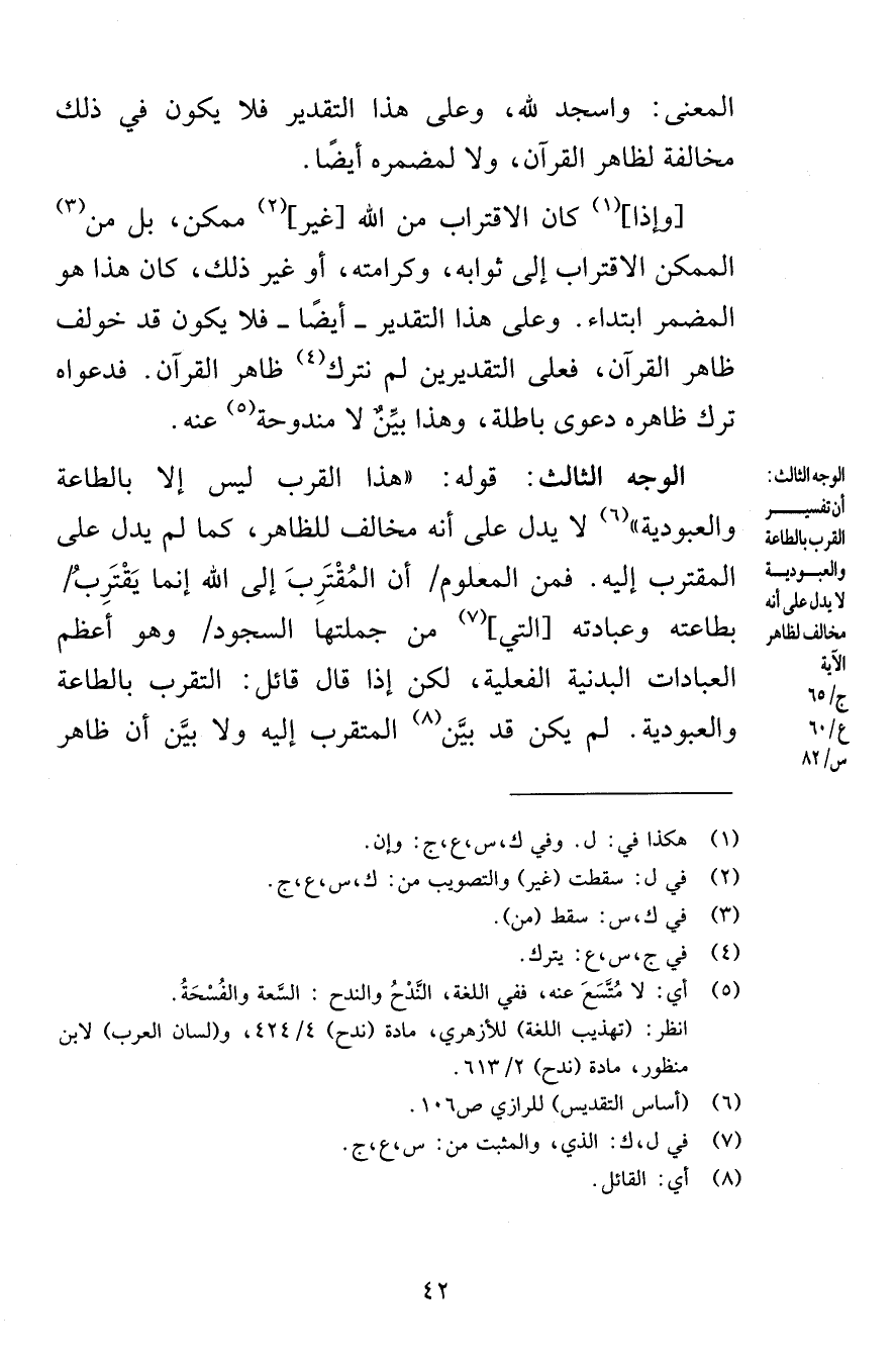 المعنى واسجد لله وعلى هذا التقدير فلا يكون في ذلك مخالفة لظاهر القرآن ولا لمضمره أيضًا وإذا كان الاقتراب من الله غير ممكن بل من الممكن الاقتراب إلى ثوابه وكرامته أو غير ذلك كان هذا هو المضمر ابتداء وعلى هذا التقدير أيضًا فلا يكون قد خولف ظاهر القرآن فعلى التقديرين لم نترك ظاهر القرآن فدعواه ترك ظاهره دعوى باطلة وهذا بيِّنٌ لا مندوحة عنه الوجه الثالث قوله هذا القرب ليس إلا بالطاعة والعبودية لا يدل على أنه مخالف للظاهر كما لم يدل على المقترب إليه فمن المعلوم أن المُقْتَرِبَ إلى الله إنما يَقْتَرِبُ بطاعته وعبادته التي من جملتها السجود وهو أعظم العبادات البدنية الفعلية لكن إذا قال قائل التقرب بالطاعة والعبودية لم يكن قد بيَّن المتقرب إليه ولا بيَّن أن ظاهر