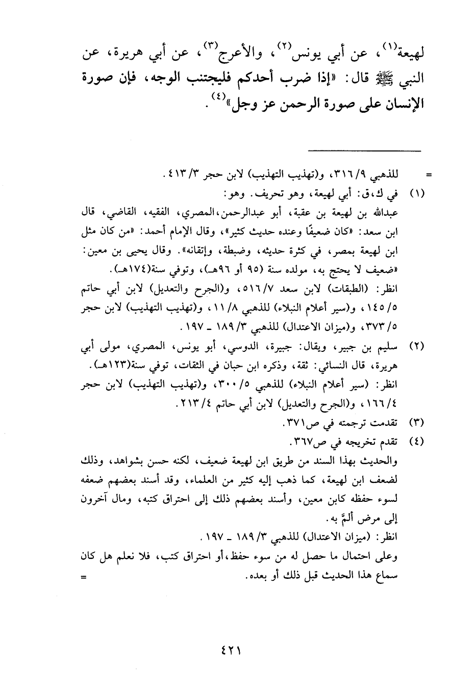 لهيعة عن أبي يونس والأعرج عن أبي هريرة عن النبي صلى الله عليه وسلم قال إذا ضرب أحدكم فليجتنب الوجه فإن صورة الإنسان على صورة الرحمن عز وجل