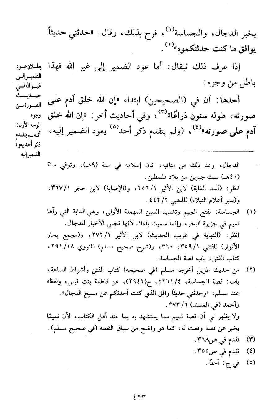 بخبر الدجال والجساسة فرح بذلك وقال حدثني حديثاً يوافق ما كنت حدثتكموه إذا عرف ذلك فيقال أما عود الضمير إلى غير الله فهذا باطل من وجوه أحدها أن في الصحيحين ابتداء إن الله خلق آدم على صورته طوله ستون ذراعاً وفي أحاديث أخر إن الله خلق آدم على صورته ولم يتقدم ذكر أحد يعود الضمير إليه