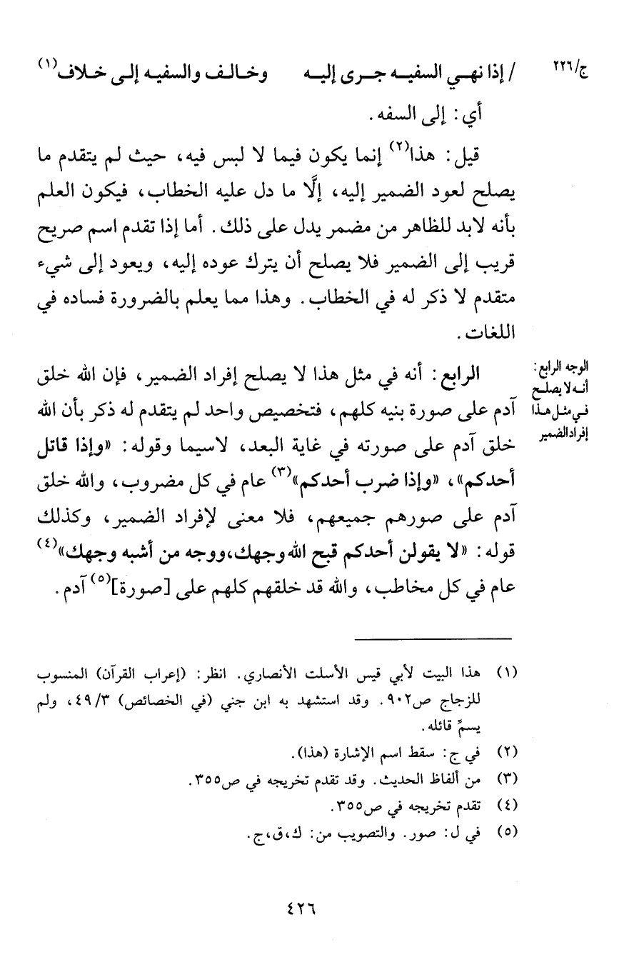إذا نهي السفيه جرى إليه وخالف والسفيه إلى خلاف أي إلى السفه قيل هذا إنما يكون فيما لا لبس فيه حيث لم يتقدم ما يصلح لعود الضمير إليه إلاَّ ما دل عليه الخطاب فيكون العلم بأنه لابد للظاهر من مضمر يدل على ذلك أما إذا تقدم اسم صريح قريب إلى الضمير فلا يصلح أن يترك عوده إليه ويعود إلى شيء متقدم لا ذكر له في الخطاب وهذا مما يعلم بالضرورة فساده في اللغات الرابع أنه في مثل هذا لا يصلح إفراد الضمير فإن الله خلق آدم على صورة بنيه كلهم فتخصيص واحد لم يتقدم له ذكر بأن الله خلق آدم على صورته في غاية البعد لاسيما وقوله وإذا قاتل أحدكم وإذا ضرب أحدكم عام في كل مضروب والله خلق آدم على صورهم جميعهم فلا معنى لإفراد الضمير وكذلك قوله لا يقولن أحدكم قبح الله وجهك ووجه من أشبه وجهك عام في كل مخاطب والله قد خلقهم كلهم على صورة آدم