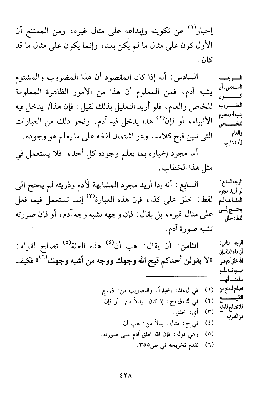 إخبار عن تكوينه وإبداعه على مثال غيره ومن الممتنع أن الأول كون على مثال ما لم يكن بعد وإنما يكون على مثال ما قد كان السادس أنه إذا كان المقصود أن هذا المضروب والمشتوم يشبه آدم فمن المعلوم أن هذا من الأمور الظاهرة المعلومة للخاص والعام فلو أريد التعليل بذلك لقيل فإن هذا يدخل فيه الأنبياء أو فإن هذا يدخل فيه آدم ونحو ذلك من العبارات التي تبين قبح كلامه وهو اشتمال لفظه على ما يعلم هو وجوده أما مجرد إخباره بما يعلم وجوده كل أحد فلا يستعمل في مثل هذا الخطاب السابع أنه إذا أريد جرد المشابهة لآدم وذريته لم يحتج إلى لفظ خلق على كذا فإن هذه العبارة إنما تستعمل فيما فعل على مثال غيره بل يقال فإن وجهه يشبه وجه آدم أو فإن صورته تشبه صورة آدم الثامن أن يقال هب أن هذه العلة تصلح لقوله لا يقولن أحدكم قبح الله وجهك ووجه من أشبه وجهك فكيف