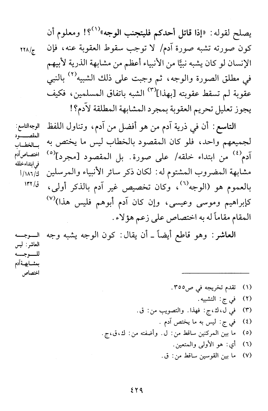 يصلح لقوله إذا قاتل أحدكم فليتجنب الوجه ومعلوم أن كون صورته تشبه صورة آدم لا توجب سقوط العقوبة عنه فإن الإنسان لو كان يشبه نبيًّا من الأنبياء أعظم من مشابهة الذرية لأبيهم في مطلق الصورة والوجه ثم وجبت على ذلك الشبيه بالنبي عقوبة لم تسقط عقوبته بهذا الشبه باتفاق المسلمين فكيف يجوز تعليل تحريم العقوبة بمجرد المشابهة المطلقة لآدم التاسع أن في ذرية آدم من هو أفضل من آدم وتناول الفظ لجميعهم واحد فلو كان المقصود بالخطاب ليس ما يختص به آدم من ابتداء خلقه على صورة بل المفصود مجرد مشابهة المضروب المشتوم له لكان ذكر سائر الأنبياء والمرسلين بالعموم هو الوجه وكان تخصيص غير آدم بالذكر أولى كإبراهيم وموسى وعيسى وإن كان آدم أبوهم فليس هذا المقام مقاماً له به اختصاص على زعم هؤلاء العاشر وهو قاطع أيضاً أن يقال كون الوجه يشبه وجه