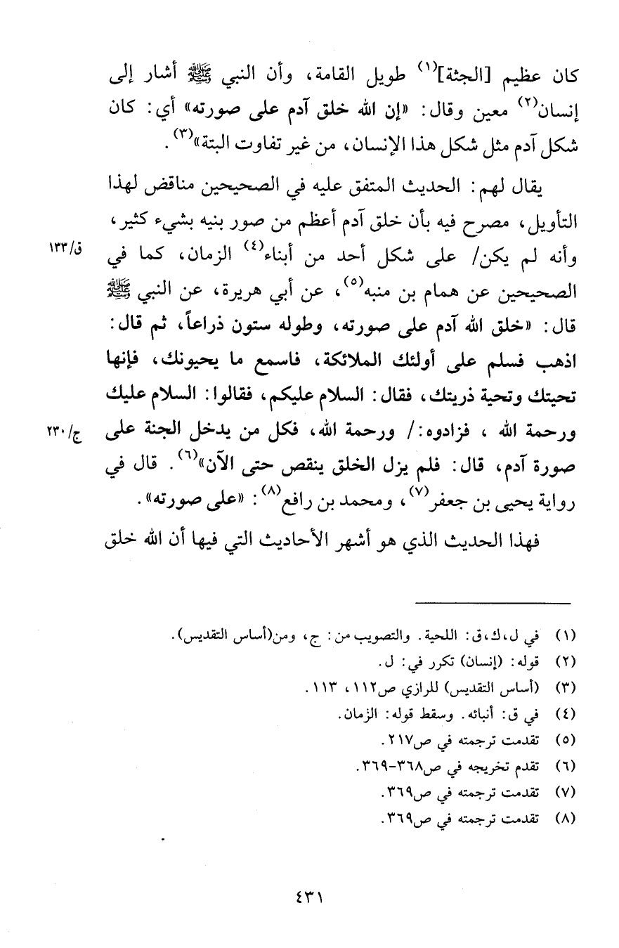 كان عظيم الجثة طويل القامة وأن النبي صلى الله عليه وسلم أشار إلى إنسان معين وقال إن الله خلق آدم على صورته أي كان شكل آدم مثل شكل هذا الإنسان من غير تفاوت البتة يقال لهم الحديث المتفق عليه في الصحيحين مناقض لهذا التأويل مصرح فيه بأن خلق آدم أعظم من صور بنيه بشيء كثير و، هـ لم يكن على شكل أحد من أبناء الزمان كما في الصحيحين عن همام بن منيه عن أبي هريرة عن النبي صلى الله عليه وسلم قال خلق اله آدم على صورته وطوله ستون ذراعاً ثم قال اذهب فسلم على أولئك الملائكة فاسمه ما يحيونك فإنها تحيتك وتحية ذريتك فقال السلام عليكم فقالو السلام عليك ورحمة الله فزادوه ورحمة الله فكل من يدخل الجنة على صورة آدم قال فلم يزل الخلق ينقص حتى الآن قال في رواية يحيى بن جعفر ومحمد بن رافع على صورته فهذا الحديث الذي هو أشهر الأحاديث التي فيها أن الله خلق