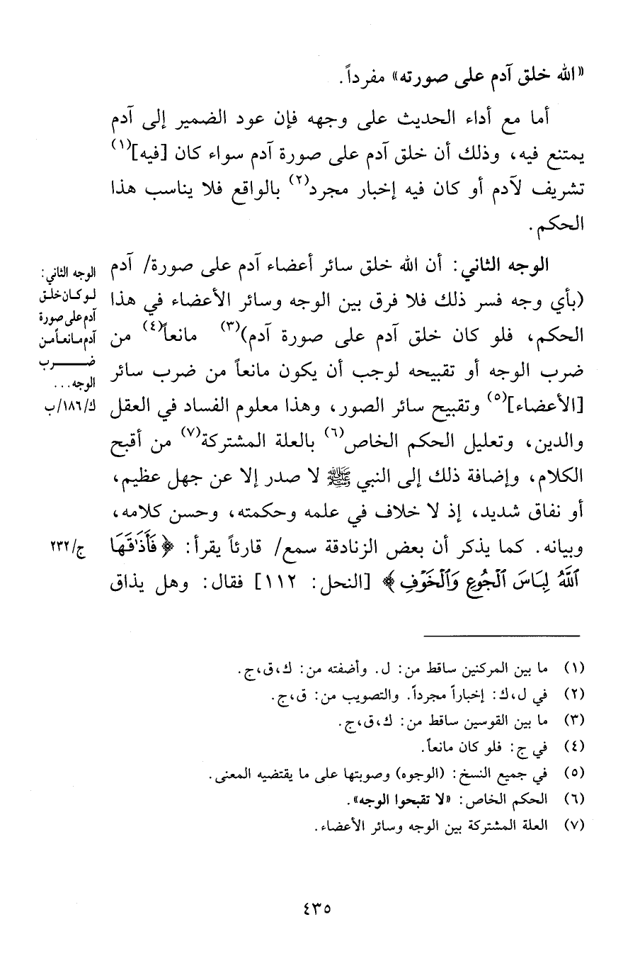 الله خلق آدم على صورته مفرداً أما مع أداء الحديث على وجهه فإن عود الضمير إلى آدم يمتنع فيه وذلك أن خلق آدم على صورة آدم سواء كان فيه تشريف لآدم أو كان فيه إخبار مجرد بالواقع فلا يناسب هذا الحكم الوجه الثاني أن الله خلق سائر أعضاء آدم على صورة آدم بأي وجه فسر ذلك فلا فرق بين الوجه وسائر الأعضاء في هذا الحكم فلو كان خلق آدم على صورة آدم مانعاً من ضرب الوجه أو تقبيحه لوجب أن يكون مانعاً من ضرب سائر الأعضاء وتقبيح سائر الصور وهذا معلوم الفساد في العقل والدين وتعليل الحكم الخاص بالعلة المشتركة من أقبح الكلام وإضافة ذلك إلى النبي صلى الله عليه وسلم لا صدر إلا عن جهل عظيم أو نفاق شديد إذ لا خلاف في علمه وحكمته وحسن كلامه وبيانه كما يذكر أن بعض الزنادقة سمع قارئاً يقرأ فَأَذَاقَهَا اللَّهُ لِبَاسَ الْجُوعِ وَالْخَوْفِ [النحل 112] فقال وهل يذاق