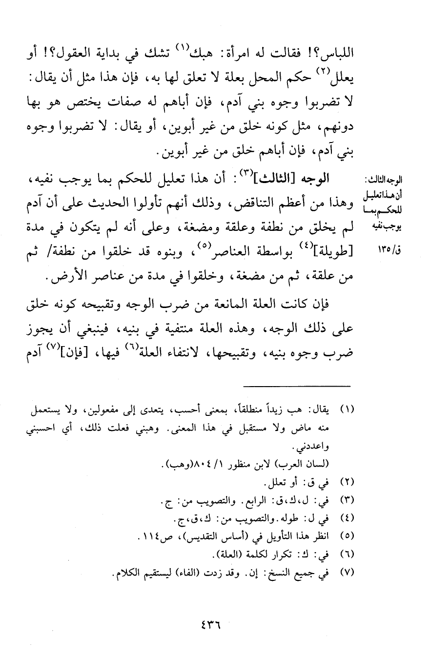 اللباس فقالت له امرأة هبك تشك في بداية العقول أو يعلل حكم المحل بعلة لا تعلق لها به فإن هذا مثل أن يقال لا تضربوه وجوه بني آدم فإن أباهم له صفات يختص هو بها دونهم مثل كونه خلق من عير أبوين أو يقال لا تضربوا وجوه بني آدم فإن أباهم خلق من غير أبوين الوجه الثالث أن هذا تعليل للحكم بنا يوجب نفيه وهذا من أعظم التناقض وذلك أنهم تأولوا الحديث على أن آدم لم يخلق من نطفة وعلقة ومضغة وعلى أنه لم يتكون في مدة طويلة بواسطة العناصر وبنوه قد خلقوا من نطفة ثم من علقة ثم من مضغة وخلقوا في مدة من عناصر الأرض فإن كانت العلة المانعة من ضرب الوجه وتقبيحه كونه خلق على ذلك الوجه وهذه العلة منتفية في بنيه فينبغي أن يجوز ضرب وجوه بنيه وتقبيحها لانتفاء العلة فيها فإن آدم