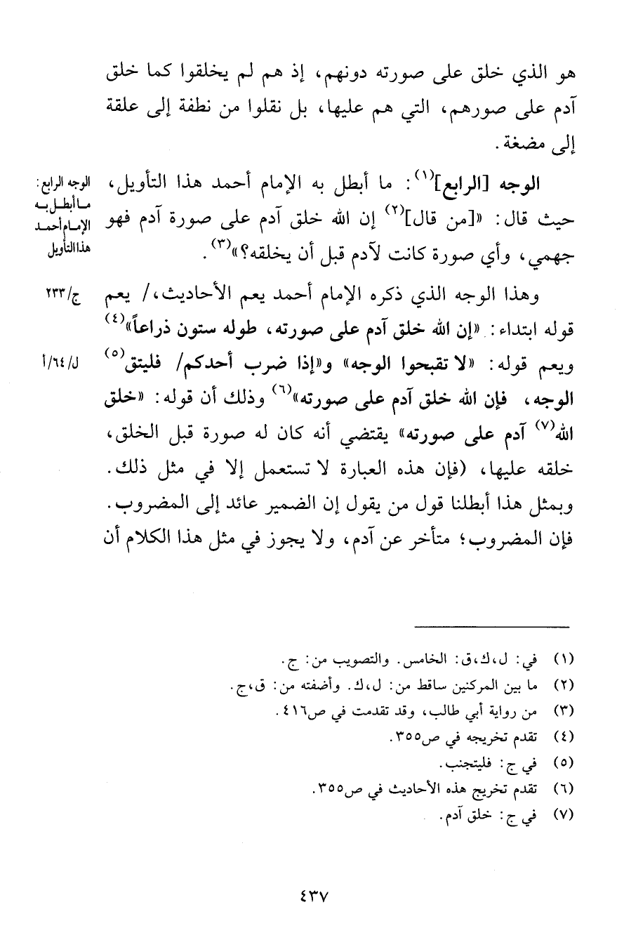 هو الذي خلق على صورته دونهم إذ هم لم يخلقوا كما خلق آدم على صورهم التي هم عليها بل نقلوا من نطفة إلى علقة إلى مضغة الوجه الرابع ما أبطل به الإمام أحمد هذا التأويل حيث قال من قال إن الله خلق آدم على صورة آدم فهو جهمي وأي صورة كانت لآدم قبل أن يخلقه وهذا الوجه الذي ذكره الإمام أحمد يعم الأحاديث يعم قوله ابتداء إن الله خلق آدم على صورته طوله ستون ذراعاً ويعم قوله لا تقبحوا الوجه وإذا ضرب أحدكم فليتق الوجه فإن الله خلق آدم على صورته وذلك أن قوله خلق الله آدم على صورته يقتضي أنه كان له صورة قبل الخلق خلقه عليه فإن هذه العبارة لا تستعمل إلا في مثل ذلك وبمثل هذا أبطلنا من يقول إن الضمير عائد إلى المضروب فإن المضروب متأخر عن آدم ولا يجوز في مثل هذا الكلام أن