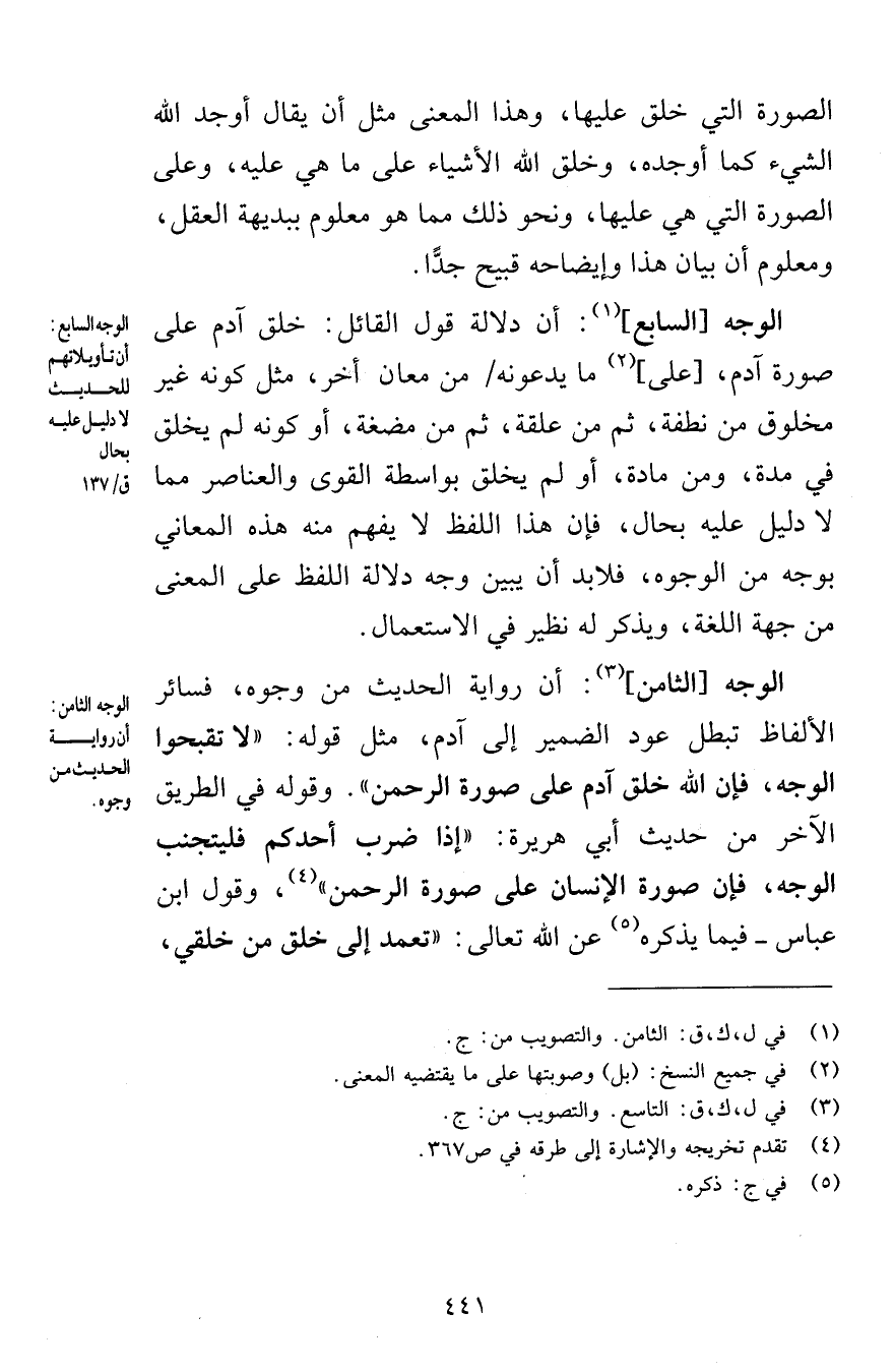 الصورة التي خلق عليها وهذا المعنى مثل أن يقال أوجد الله الشيء كما أوجده وخلق الله الأشياء على ما هي عليه وعلى الصورة التي هي عليها ونحو ذلك مما هو معلوم ببديهة العقل ومعلوم أن بيان هذا وإيضاحه قبيح جدًّا الوجه السابع أن دلالة قول القائل خلق آدم على صورة آدم على ما يدعونه من معان أخر مثل كونه غير مخلوق من نطفة ثم من علقة ثم من مضغة أو كونه لم يخلق في مدة ومن مادة أو لم يخلق بواسطة القوى والعناصر مما لا جليل عليه بحال فإن هذا اللفظ لا يفهم منه هذه المعاني بوجه من الوجوه فلابد أن يبين وجه دلالة اللفظ على المعنى من جهة اللغة ويذكر له نظير في الاستعمال الوجه الثامن أن رواية الحديث من وجوه فسائر الألفاظ تبطل عود الضمير إلى آدم مثل قوله لا تقبحوا الوجه فإن الله خلق آدم على صورة الرحمن وقوله في الطريق الآخر من حديث أبي هريرة إذا ضرب أحدكم فليتجنب الوجه فإن صورة الإنسان على صورة الرحمن وقول ابن عباس فيما يذكره عن الله تعالى تعمد إلى خلق من خلقي