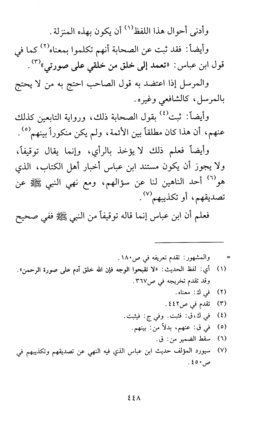 وأدنى أحوال هذا اللفظ أن يكون بهذه المنزلة وأيضاً فقد ثبت عن الصحابة أنهم تكلموا بمعناه كما في قول ابن عباس تعمد إلى خلق من خلقي على صورتي والمرسل إذا اعتضد به قول الصاحب احتج به من لا يحتج بالمرسل كالشافعي وغيره وأيضاً ثبت بقول الصحابة ذلك ورواية التابعين كذلك عنهم أن هذا كان مطلقاً بين الأئمة ولم يكن منكوراً بينهم وأيضاً فعلم ذلك لا يؤخذ بالرأي وإنما يقال توقيفاً ولا يجوز أن يكون مستند ابن عباس أخبار أهل الكتاب الذي هو أحد الناهين لنا عن سؤالهم ومع نهي النبي صلى الله عليه وسلم عن تصديقهم أو تكذيبهم فعلم أن ابن عباس إنما قاله توقيفاً من النبي صلى الله عليه وسلم ففي صحيح