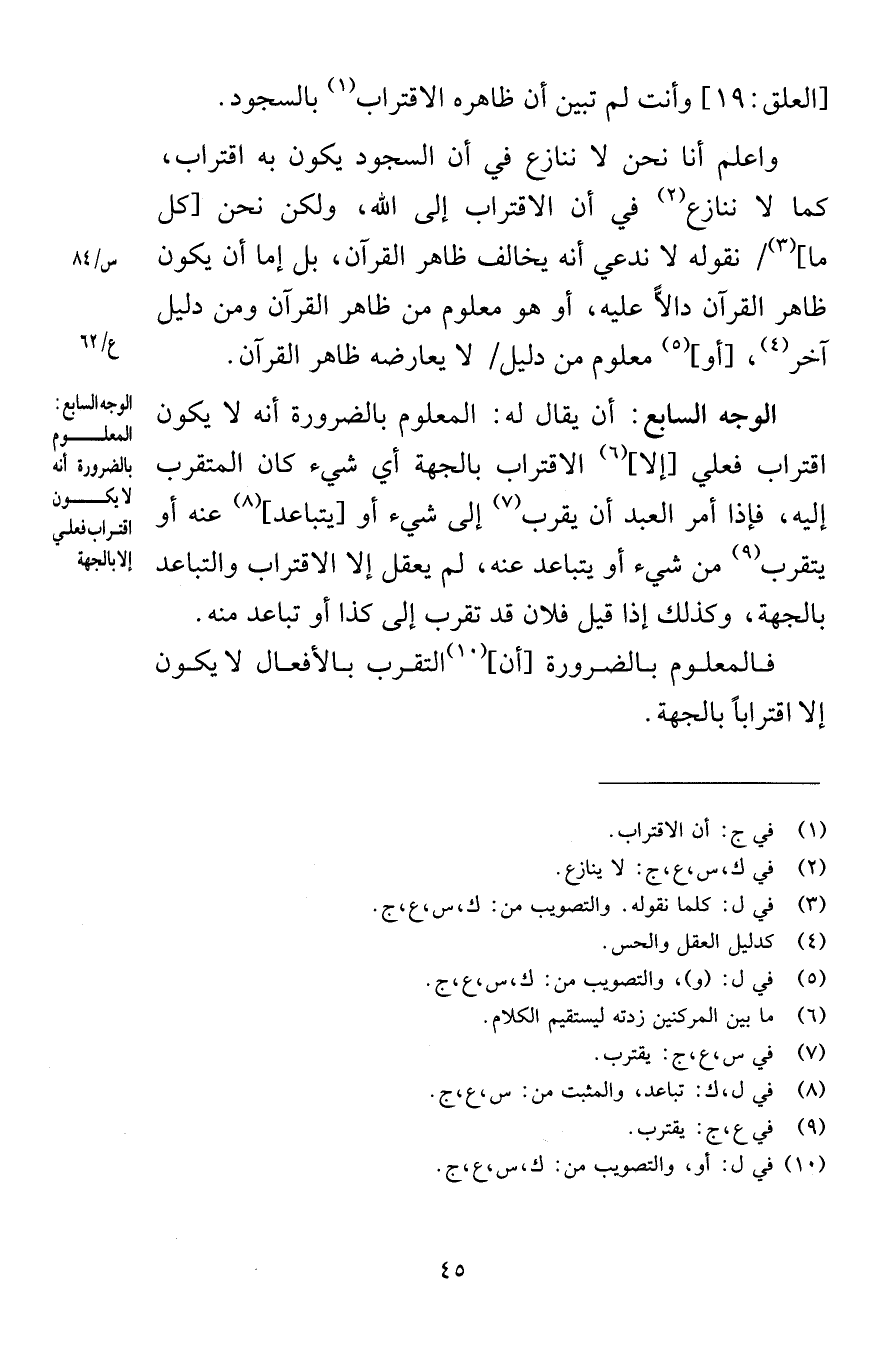 [العلق 19] وأنت لم تبين أن ظاهره الاقتراب بالسجود واعلم أنا نحن لا ننازع في السجود يكون بع اقتراب كما لا ننازع في أن الاقتراب إلى الله ولكن نحن كل ما نقوله لا ندعي أنه يخالف ظاهر القرآن بل إما أن يكون ظاهر القرآن دالاًّ عليه أو هو معلوم من ظاهر القرآن ومن دليل آخر أو معلوم من دليل لا يعارضه ظاهر القرآن الوجه السابع أن يقال له المعلوم بالضرورة أنه لا يكون اقتراب فعلي إلا الاقتراب بالجهة أي شيء كان المتقرب إليه فإذا أمر العبد أن يقرب إلى شيء أو يتباعد عنه أو يتقرب من شيء أو يتباعد عنه لم يعقل إلا الاقتراب والتباعد بالجهة وكذلك إذا قيل فلان قد تقرب إلى كذا أو تباعد منه فالمعلوم بالضرورة أن التقرب بالأفعال لا يكون إلا اقتراباً بالجهة