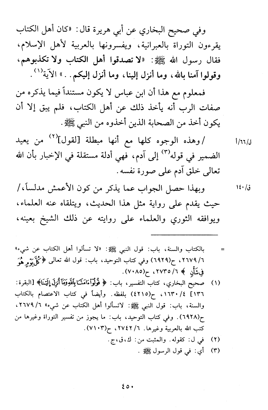 وفي صحيح البخاري عن أبي هريرة قال كان أهل الكتاب يقرءون التوراة بالعبرانية ويفسرونها بالعربية لأهل الإسلام فقال رسول الله صلى الله عليه وسلم لا تصدقوا أهل الكتاب ولا تكذبوهم وقولوا آمنا بالله وما أنزل إلينا وما أنزل إليكم الآية فمعلوم مع هذا أن ابن عباس لا يكون مستنداً فيما يذكره من صفات الرب أنه يأخذ ذلك عن أهل الكتاب فلم يبق إلا أن يكون أخذ من الصحابة الذين أخذوه من النبي صلى الله عليه وسلم وهذه الوجوه كلها مع أنها مبطلة لقول من يعيد الضمير في قوله على آدم فهي أدلة مستقلة في الإخبار بأن الله تعالى خلق آدم على صورة نفسه وبهذا حصل الجواب عما يذكر من كون الأعمش مدلساً حيث يقدم على رواية مثل هذا الحديث ويتلقاه عنه العلماء ويوافقه الثوري والعلماء على روايته عن ذلك الشيخ بعينه