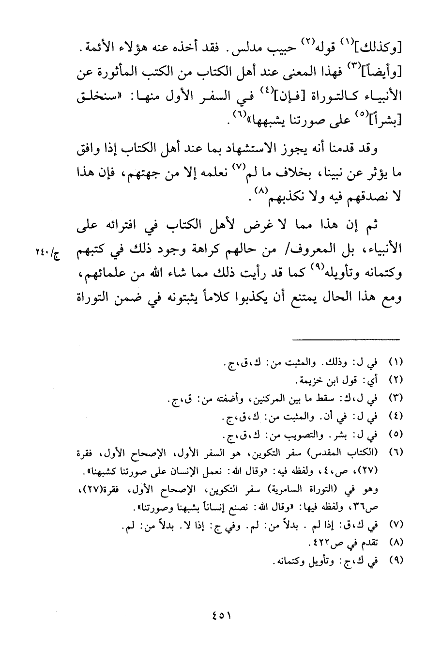 وكذلك قوله حبيب مدلس فقد أخذه عنه هؤلاء الأئمة وأيضاً فهذا المعنى عند أهل الكتاب من الكتب المأثورة عن الأنبياء كالتوراة فإن في السفر الأول منها سنخلق بشراً على صورتنا يشبهها وقد قدمنا أنه يجوز الاستشهاد بما عند أهل الكتاب إذا وافق ما يؤثر عن نبينا بخلاف ما لم نعلمه إلا من جهتهم فإن هذا لا نصدقهم فيه ولا نكذبهم ثم إن هذا مما لا غرض لأهل الكتاب في افترائه على الأنبياء بل المعروف من حالهم كراهة وجود ذلك في كتبهم وكتمانه وتأويله كما قد رأيت ذلك مما شاء الله من علمائهم ومع هذا الحال يمتنع أن يكذبوا كلاماً يثبتونه في ضمن التوراة