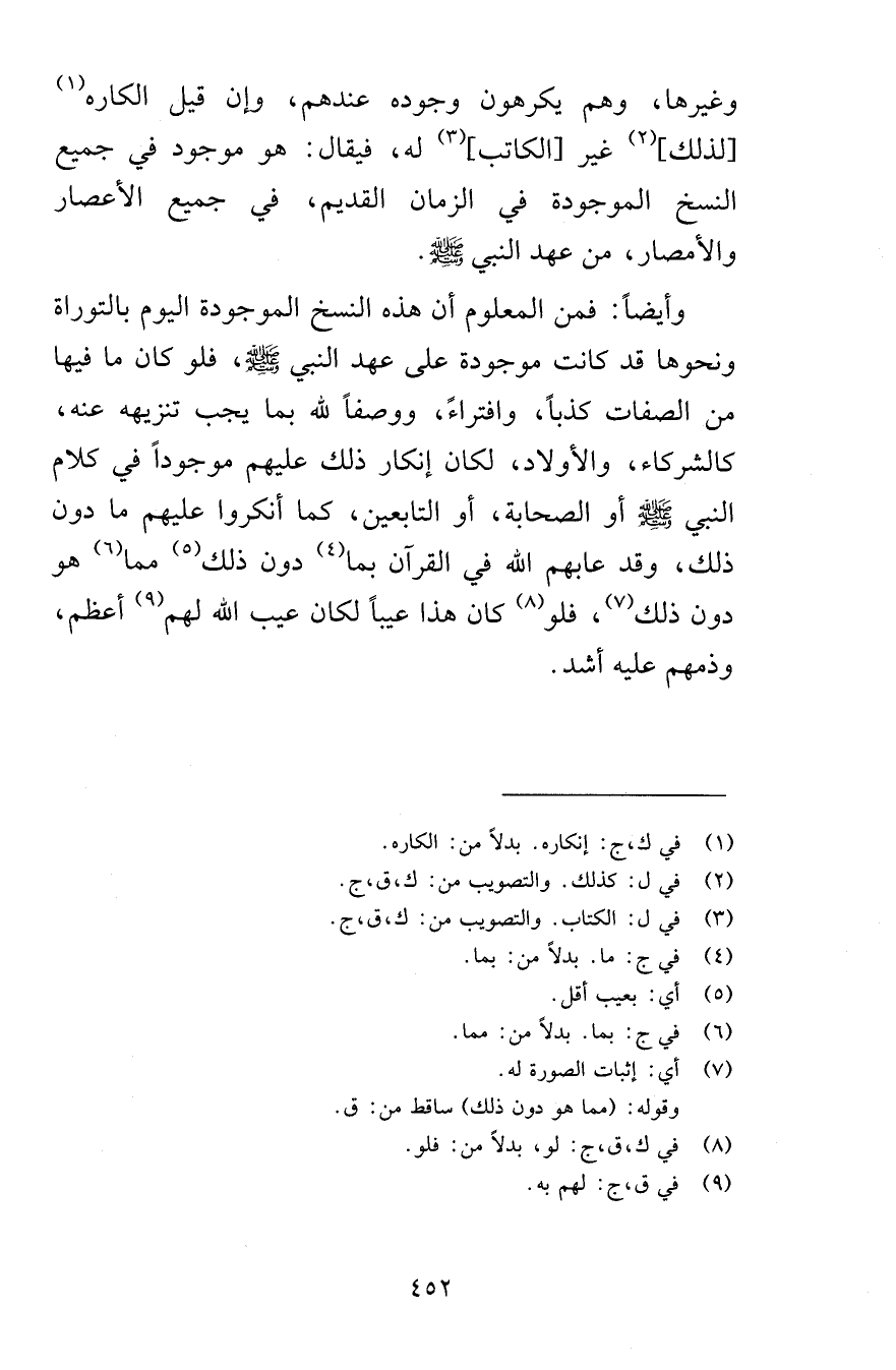 وغيرها وهم يكرهون وجوده عندهم وإن قيل الكاره لذلك غير الكاتب له فيقال هو موجود في جميع النسخ الموجودة في الزمان القديم في جميع الأعصار والأمصار من عهد النبي صلى الله عليه وسلم وأيضاً فمن المعلوم أن هذه النسخ الموجودة اليوم بالتوراة ونحوها قد كانت موجودة على عهد النبي صلى الله عليه وسلم فلو كان ما فيها من الصفات كذباً وافتراءً ووصفاً لله بما يجب تنزيهه عنه كالشركاء والأولاد لكان إنكار ذلك عليهم موجوداً في كلام النبي صلى الله عليه وسلم أو الصحابة أو التابعين كما أنكروا عليهم مادون ذلك وقد عابهم الله في القرآن بما دون ذلك مما هو دون ذلك فلو كان هذا عيباً لكان عيب الله لهم أعظم وذمهم عليه أشد