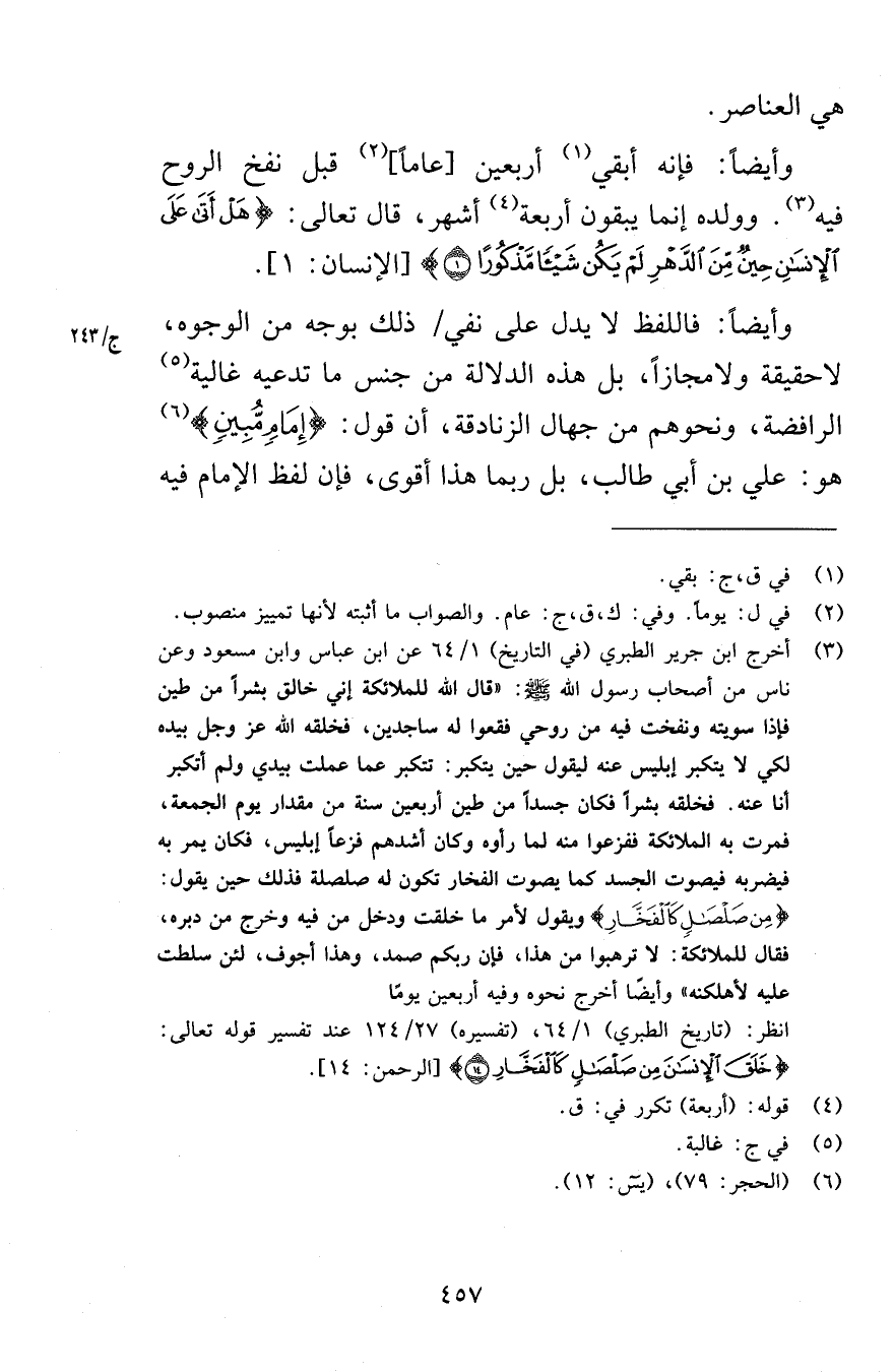 هي العناصر وأيضاً فإنه أبقي أربعين عاماً قبل نفخ الروح فيه وولده إنما يبقون أربعة أشهر قال تعالى هَلْ أَتَى عَلَى الْإِنْسَانِ حِينٌ مِنَ الدَّهْرِ لَمْ يَكُنْ شَيْئًا مَذْكُورًا (1) [الإنسان 1] وأيضاً فاللفظ لا يدل على نفي ذلك بوجه من الوجوه لا حقيقة ولا مجازاً بل هذه الدلالة من جنس ما تدعيه غالية الرافضة ونحوهم من جهال الزنادقة أن قول إِمَامٍ مُبِينٍ هو علي بن أبي طالب بل ربما هذا أقوى فإن لفظ الإمام فيه