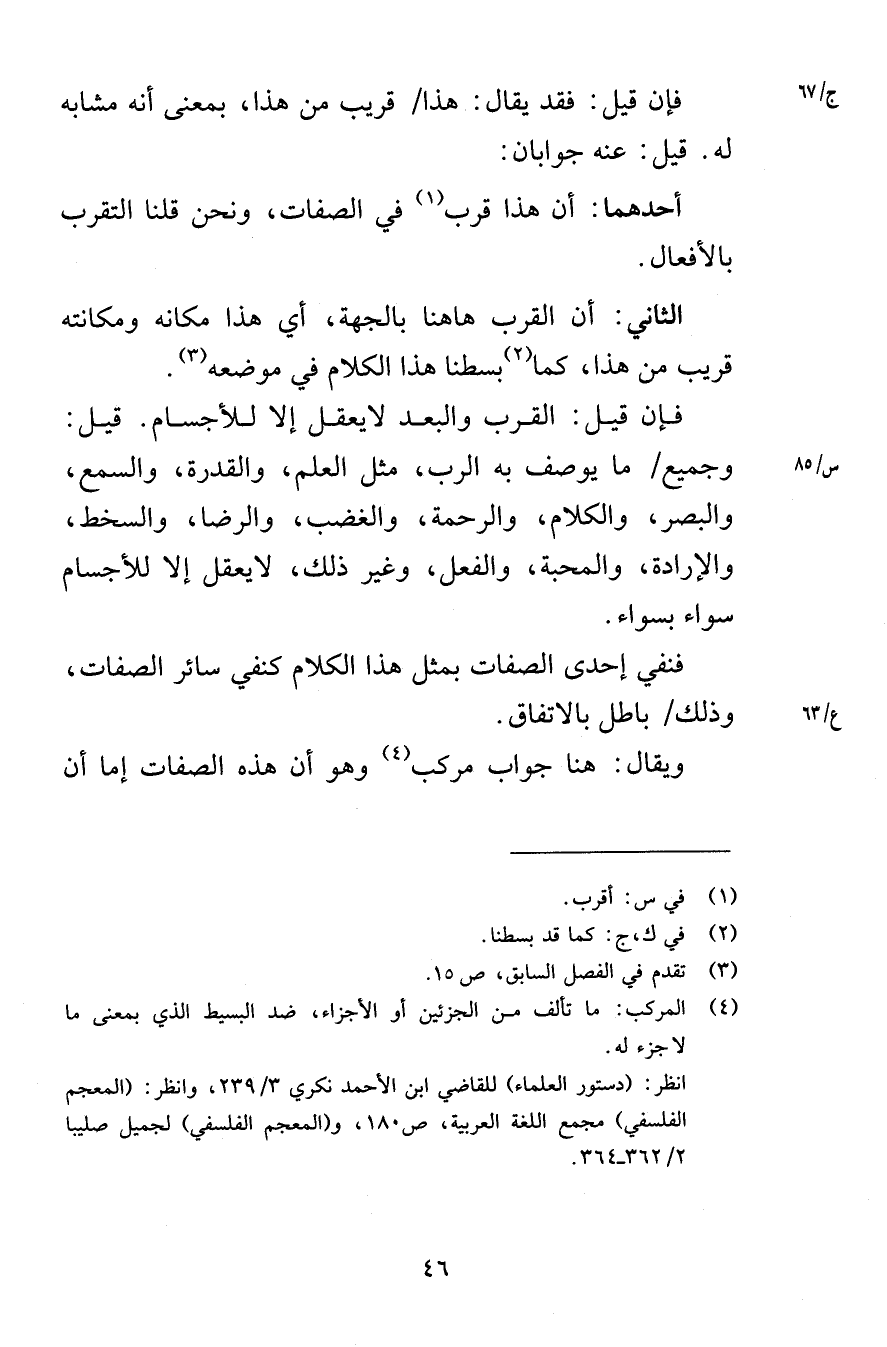 فإن قيل فقد يقال هذا قريب من هذا بمعنى أنه مشابه له قيل عنه جوابان أحدهما أن هذا قرب في الصفات ونحن قلنا التقرب بالأفعال الثاني أن القرب هاهنا بالجهة أي هذا مكانه ومكانته قريب من هذا كما بسطنا هذا الكلام في موضعه فإن قيل القرب والبعد لا يعقل إلا للأجسام قيل وجميع ما يوصف به الرب مثل العلم والقدرة والسمع والبصر والكلام والرحمة والغضب والرضا والسخط والإرادة والمحبة والفعل وغير ذلك لا يعقل إلا للأجسام سواء بسواء فنفي إحدى الصفات بمثل هذا الكلام كنفي سائر الصفات وذلك باطل بالاتفاق ويقال هنا جواب مركب وهو أن هذه الصفات إما أن