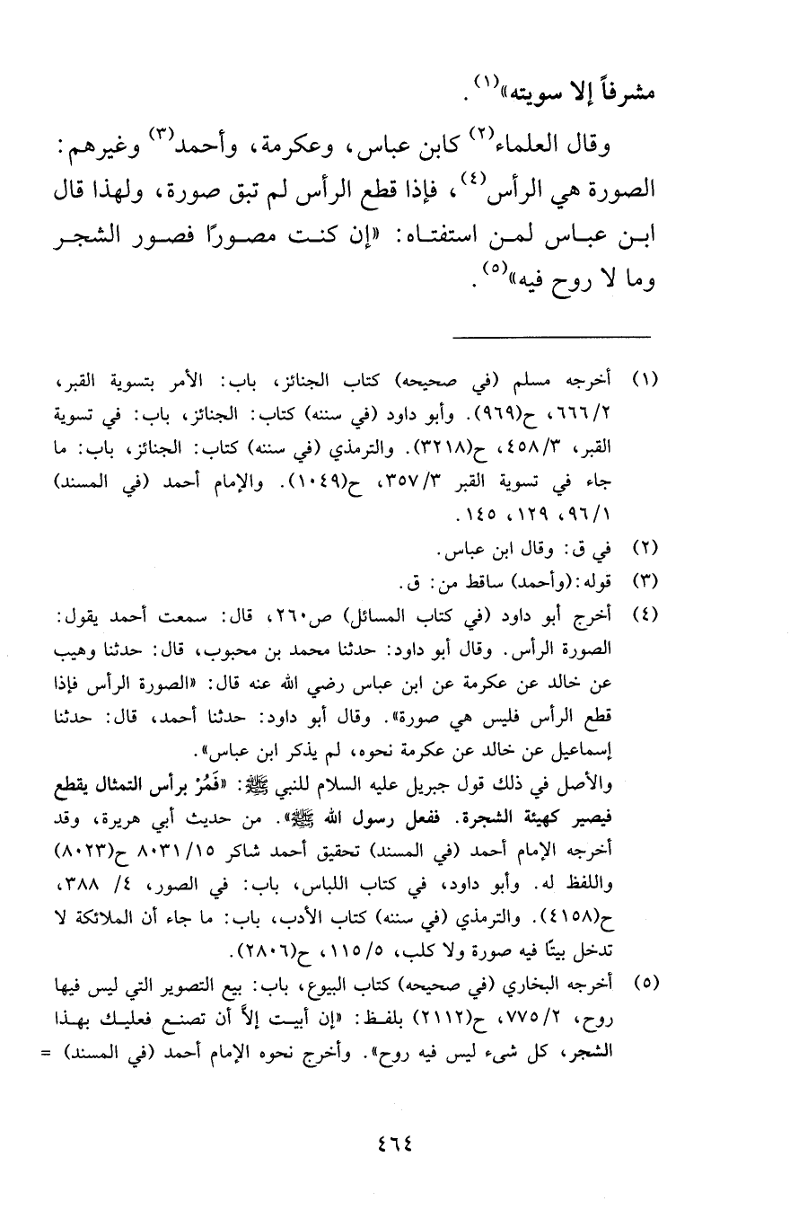 مشرفاً إلا سويته وقال العلماء كابن عباس وعكرمة واحمد وغيرهم الصورة هي الرأس فإذا قطع الرأس لم تبق صورة ولهذا قال ابن عباس لمن استفتاه إن كنت مصوراً فصور الشجر وما لا روح فيه