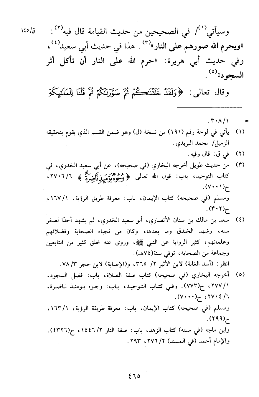 وسيأتي في الصحيحين من حديث القيامة قال فيه ويحرم الله صورهم على النار هذا في حديث أبي سعيد وفي حديث أبي هريرة حرم الله على النار أن تأكل أثر السجود وقال تعالى وَلَقَدْ خَلَقْنَاكُمْ ثُمَّ صَوَّرْنَاكُمْ ثُمَّ قُلْنَا لِلْمَلَائِكَةِ