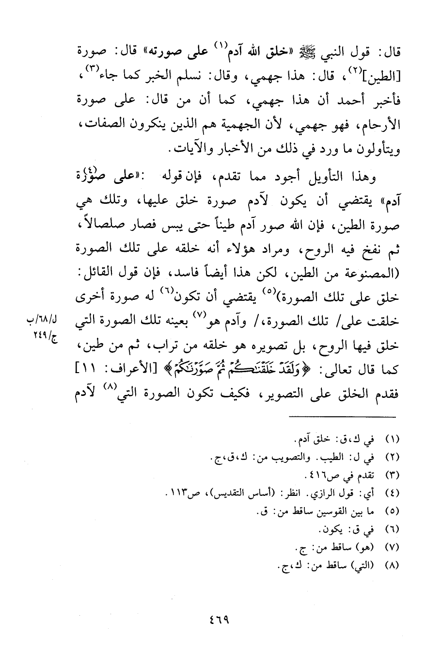قال قول النبي صلى الله عليه وسلم خلق الله آدم على صورته قال صورة الطين قال هذا جهمي وقال نسلم الخبر كما جاء فأخبر أحمد أن هذا جهمي كما أن من قال على صورة الأرحام فهو جهمي لأن الجهمية هم الذين ينكرون الصفات ويتأولون ما ورد في ذلك من الأخبار والآيات وهذا التأويل أجود مما تقدم فإن قوله على صورة آدم يقتضي أن يكون لآدم صورة خلق عليها وتلك هي صورة الطين فإن الله صور آدم طيناً حتى يبس فصار صلصالاً ثم نفخ فيه الروح ومراد هؤلاء أنه خلقه على تلك الصورة المصنوعة من الطين لكن هذا أيضاً فاسد فإن قول القائل خلق على تلك الصورة يقتضي أن تكون له صورة أخرى خلقت على تلك الصورة وآدم هو بعينه تلك الصورة التي خلق فيها الروح بل تصويره هو خلقه من تراب ثم من طين كما قال تعالى وَلَقَدْ خَلَقْنَاكُمْ ثُمَّ صَوَّرْنَاكُمْ [الأعراف 11] فقدم الخلق على التصوير فكيف تكون الصورة التي لآدم