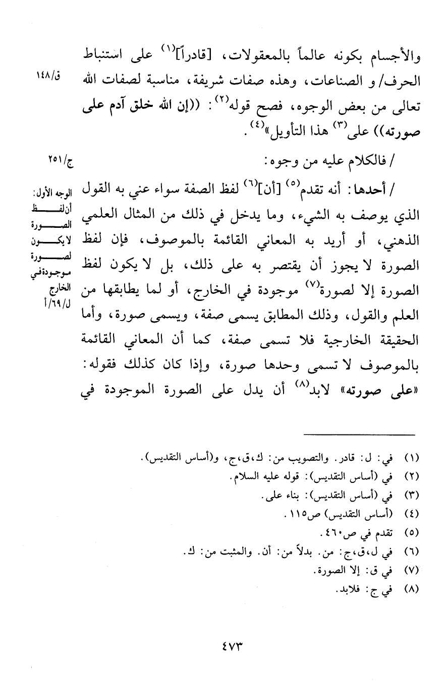 والأجسام بكونه عالماً بالمعقولات قادراً على استنباط الحرف والصناعات وهذه صفات شريفة مناسبة لصفات الله تعالى من بعض الوجوه فصح قوله إن الله خلق آدم على صورته على هذا التأويل فالكلام عليه من وجوه أحدها أنه تقدم أن لفظ الصفة سواء عني به القول الذي يوصف به الشيء وما يدخل في ذلك من المثال العلمي الذهني أو أريد به المعاني القائمة بالموصوف فإن لفظ الصورة لا يجوز أن يقتصر به على ذلك بل لا يكون لفظ الصورة إلا لصورة موجودة في الخارج أو لما يطابقها من العلم والقول وذلك المطابق يسمى صفة ويسمى صورة وأما الحقيقة الخارجية فلا تسمى صفة كما أن المعاني القائمة بالموصوف لا تسمى وحدها صورة وإذا كان كذلك فقوله على صورته لابد أن يدل على الصورة الموجودة في