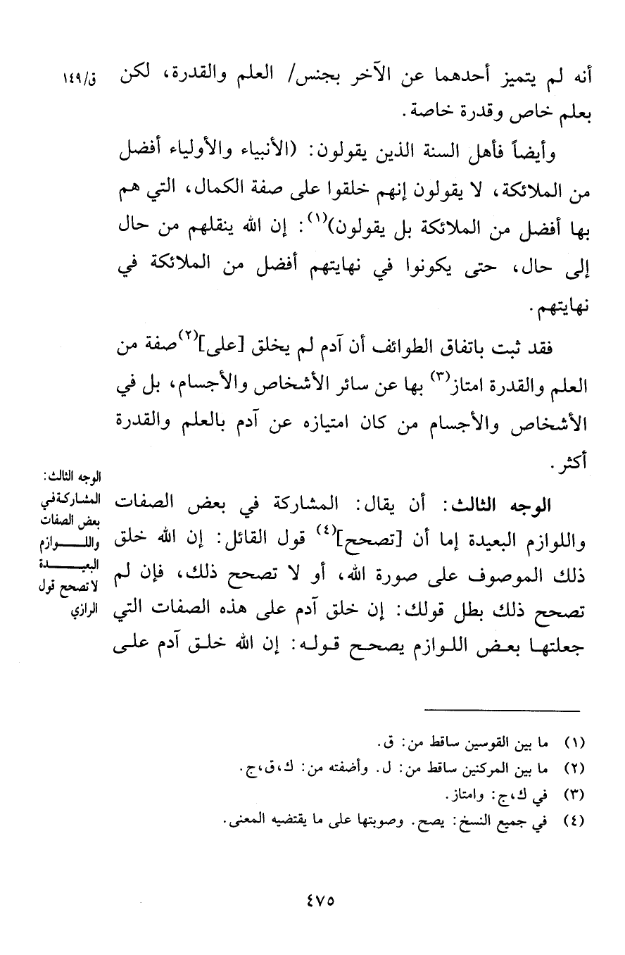 أنه لم يتميز أحدهمَا عن الآخر بجنس العلم والقدرة لكن بعلم خاص وقدرة خاصة وأيضاً فأهل السنة الذين يقولون الأنبياء والأولياء أفضل من الملائكة لا يقولون إنهم خلقوا على صفة الكمال التي هم بها أفضل من الملائكة بل يقولون إن الله ينقلهم من حال إلى حال حتى يكونوا في نهايتهم أفضل من الملائكة في نهايتهم فقد ثبت باتفاق الطوائف أن آدم لم يخلق على صفة من العلم والقدرة امتاز بها عن سائر الأشخاص والأجسام بل في الأشخاص والأجسام من كان امتيازه عن آدم بالعلم والقدرة أكثر الوجه الثالث أن يقال المشاركة في بعض الصفات واللوازم البعيدة إما أن تصحح قول القائل إن الله خلق ذلك الموصوف على صورة الله أو لا تصحح ذلك فإن لم تصحح ذلك بطل قولك إن خلق آدم على هذه الصفات التي جعلتها بعض اللوازم يصحح قوله إن الله خلق آدم على