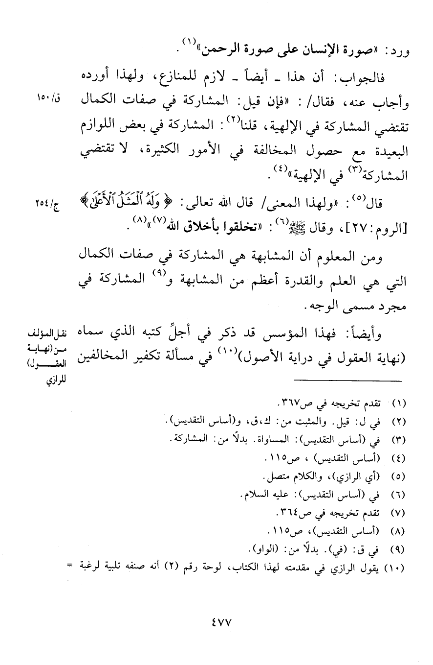 ورد صورة الإنسان على صورة الرحمن فالجواب أن هذا أيضاً لازم للمنازع ولهذا أورده وأجاب عنه فقال فإن قيل المشاركة في صفات الكمال تقتضي المشاركة في الإلهية قلنا المشاركة في بعض اللوازم البعيدة مع حصول المخالفة في الأمور الكثيرة لا تقتضي المشاركة في الإلهية قال ولهذا المعنى قال الله تعالى وَلَهُ الْمَثَلُ الْأَعْلَى [الروم 27] وقال صلى الله عليه وسلم تخلقوا بأخلاق الله ومن المعلوم أن المشابهة هي المشاركة في صفات الكمال التي هي العلم والقدرة أعظم من المشابهة والمشاركة في مجرد مسمى الوجه وأيضاً فهذا المؤسس قد ذكر في أجلِّ كتبه الذي سماه نهاية العقول في دراية الأصول في مسألة تكفير المخالفين