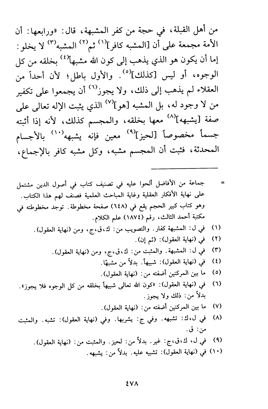 من أهل القبلة في حجة من كفر المشبهة قال ورابعها أن الأمة مجمعة على أن المشبه كافر ثم المشبه لا يخلو إما أن يكون هو الذي يذهب إلى كون الله مشبهاً بخلقه من الوجوه أو ليس كذلك والأول باطل لأن أحداً من العقلاء لم يذهب إلى ذلك ولا يجوز أن يجمعوا على تكفير من لا وجود له بل المشبه هو الذي يثبت الإله تعالى على صفة يشبهه معها بخلقه والمجسم كذلك لأنه إذا أثبته جسماً مخصوصاً لحيز معين فإنه يشبهه بالأجسام المحدثة فثبت أن المجسم مشبه وكل مشبه كافر بالإجماع