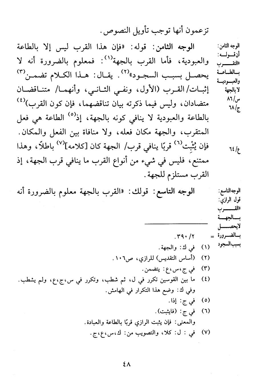 تزعمون أنها توجب تأويل النصوص الوجه الثامن قوله فإن هذا القرب ليس إلا بالطاعة والعبودية فأما القرب بالجهة فمعلوم بالضرورة أنه لا يحصل بسبب السجود يقال هذا الكلام تضمن إثبات القرب الأول ونفي الثاني وأنهما متناقضان متضادان وليس فيما ذكرته بيان تناقضهما فإن كون القرب بالطاعة والعبودية لا ينافي كونه بالجهة إذ الطاعة هي فعل المقترب والجهة مكان فعله ولا منافاة بين الفعل والمكان فإن يُثْبِت قربًا ينافي قرب الجهة كان كلامه باطلاً وهذا ممتنع فليس في شيء من أنواع القرب ما ينافي قرب الجهة إذ القرب مستلزم الجهة الوجه التاسع قولك القرب بالجهة معلوم بالضرورة أنه