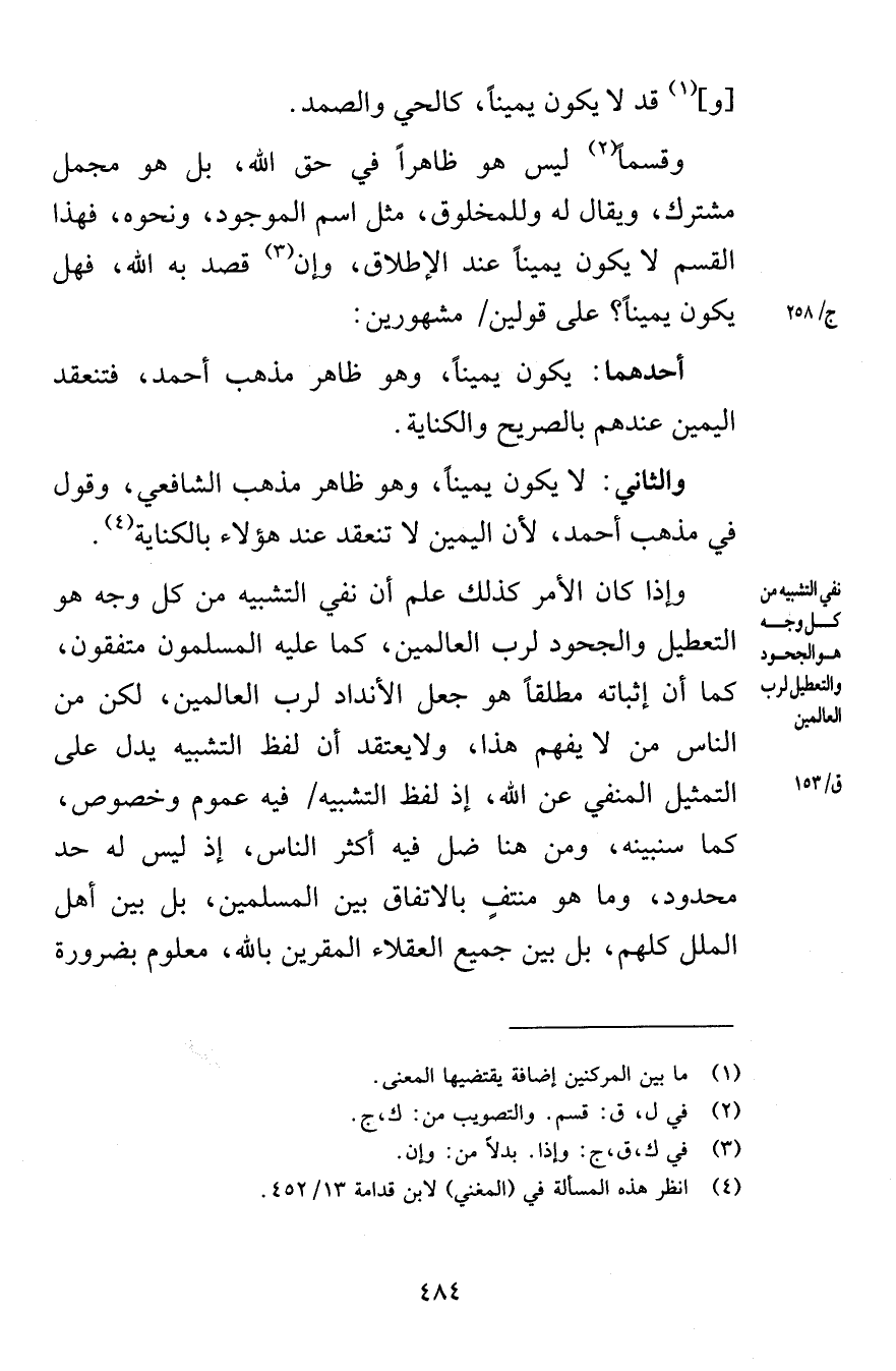 وقد لا يكون يميناً كالحي والصمد وقسماً ليس هو ظاهراً في حق الله بل هو مجمل مشترك ويقال له وللمخلوق مثل اسم الموجود ونحوه فهذا القسم لا يكون يميناً عند الإطلاق وإن قصد به الله فهل يكون يميناً على قولين مشهورين أحدهما يكون يميناً وهو ظاهر مذهب أحمد فتنعقد اليمين عندهم بالصريح والكناية والثاني لا يكون يميناً وهو ظاهر مذهب الشافعي وقول في مذهب أحمد لأن اليمين لا تنعقد عند هؤلاء بالكناية وإذا كان الأمر كذلك علم أن نفي التشبيه من كل وجه هو التعطيل والجحود لرب العالمين كما عليه المسلمون متفقون كما أن إثباته مطلقاً هو جعل الأنداد لرب العالمين لكن من الناس من لا يفهم هذا ولا يعتقد أن لفظ التشبيه يدل على التمثيل المنفي عن الله إذ لفظ التشبيه فيه عموم وخصوص كما سنبينه ومن هنا ضل فيه أكثر الناس إذ ليس له حد محدود وما هو منتفٍ بالاتفاق بين المسلمين بل بين أهلل الملل كلهم بل بين جميع العقلاء المقرين بالله معلوم بالضرورة