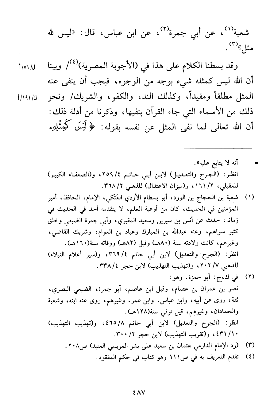شعبة عن أبي جمرة عن ابن عباس قال ليس لله مثل وقد بسطنا الكلام على هذا في الأجوبة المصرية وبينا أن الله ليس كمثله شيء بوجه من الوجوه فيجب أن ينفى عنه المثل مطلقاً ومقيداً وكذلك الند والكفو والشريك ونحو ذلك من الأسماء التي جاء القرآن بنفيها وذكرنا من أدلة ذلك أن الله تعالى لما نفى المثل عن نفسه بقوله لَيْسَ كَمِثْلِهِ
