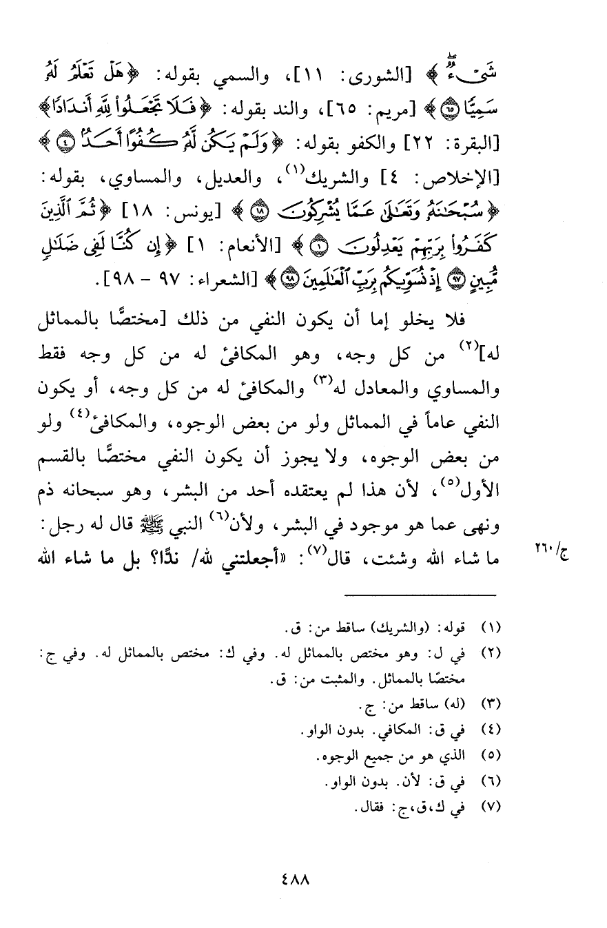 شَيْءٌ [الشورى 11] والسمي بقوله هَلْ تَعْلَمُ لَهُ سَمِيًّا (65) [مريم 65] والند بقوله فَلَا تَجْعَلُوا لِلَّهِ أَنْدَادًا [البقرة 22] والكفو بقوله وَلَمْ يَكُنْ لَهُ كُفُوًا أَحَدٌ (4) [الإخلاص 4] والشريك والعديل والمساوي بقوله سُبْحَانَهُ وَتَعَالَى عَمَّا يُشْرِكُونَ (18) [يونس 18] ثُمَّ الَّذِينَ كَفَرُوا بِرَبِّهِمْ يَعْدِلُونَ (1) [الأنعام 1] إِنْ كُنَّا لَفِي ضَلَالٍ مُبِينٍ (97) إِذْ نُسَوِّيكُمْ بِرَبِّ الْعَالَمِينَ (98) [الشعراء 97-98] فلا يخلو إما أن يكون النفي من ذلك مختصًّا بالمماثل له من كل وجه وهو المكافئ له من كل وجه فقط والمساوي والمعادل له والمكافئ له من كل وجه أو يكون النفي عاماً في المماثل ولو من بعض الوجوه والمكافئ ولو من بعض الوجوه ولا يجوز أن يكون النفي مختصًّا بالقسم الأول لأن هذا لم يعتقده أحد من البشر وهو سبحانه ذم ونهى عما هو موجود في البشر ولأن النبي صلى الله عليه وسلم قال له رجل ما شاء الله وشئت قال أجعلتني لله ندًّا بل ما شاء الله