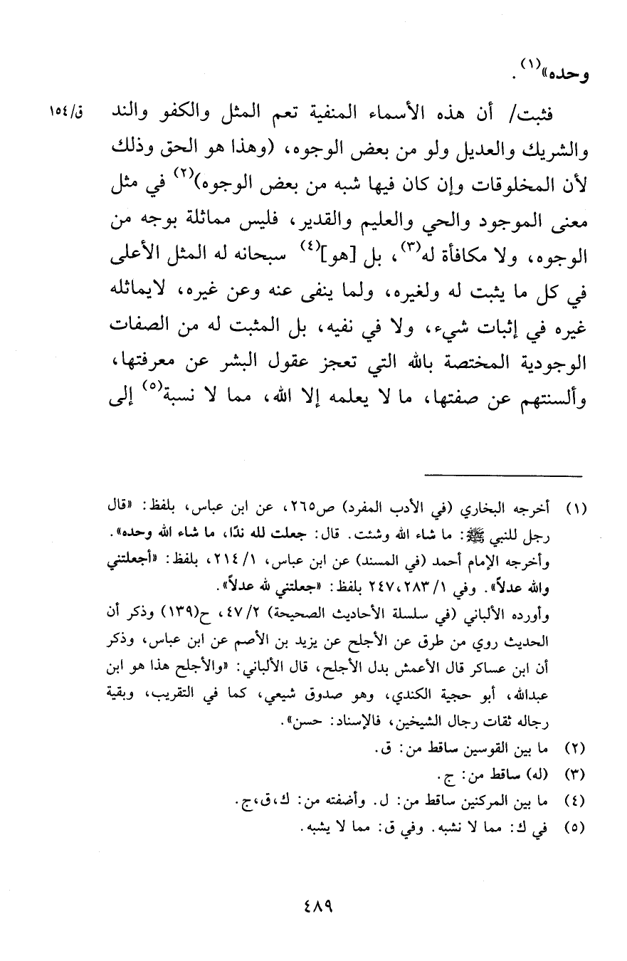 وحده فثبت أن هذه الأسماء المنفية تعم المثل والكفو والند والشريك والعديل ولو من بعض الوجوه وهذا هو الحق وذلك لأن المخلوقات وإن كان فيها شبه من بعض الوجوه في مثل معنى الموجود والحي والعليم والقدير فليس مماثلة بوجه من الوجوه ولا مكافأة له بل هو سبحانه له المثل الأعلى في كل ما يثبت له ولغيره ولما ينفى عنه وعن غيره لا يماثله غيره في إثبات شيء ولا في نفيه بل المثبت له من الصفات الوجودية المختصة بالله التي تعجز عقول البشر عن معرفتها وألسنتهم عن صفتها ما لا يعلمه إلا الله مما لا نسبة إلى