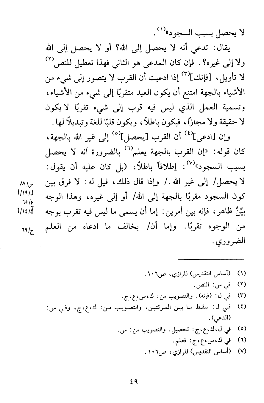 لا يحصل بسبب السجود يقال تدعي أنه لا يحصل إلى الله أو لا يحصل إلى الله ولا إلى غيره فإن كان المدعى هو الثاني فهذا تعطيل للنص لا تأويل فإنك إذا ادعيت أن القرب لا يتصور إلى شيء من الأشياء بالجهة امتنع أن يكون العبد متقربًا إلى شيء من الأشياء وتسمية العمل الذي ليس فيه قرب إلى شيء تقربًا لا يكون لا حقيقة ولا مجازًا فيكون باطلاً ويكون قلبًا للغة وتبديلاً لها وإن ادعى أن القرب يحصل إلى غير الله بالجهة كان قوله إن القرب بالجهة يعلم بالضرورة أنه لا يحصل بسبب السجود إطلاقاً باطلاً بل كان عليه أن يقول لا يحصل إلى غير الله وإذا قال ذلك قيل له لا فرق بين كون السجود مقربًا بالجهة إلى الله أو إلى غيره وهذا الوجه بيِّنٌ ظاهر فإنه بين أمرين إما أن يسمى ما ليس فيه تقرب بوجه من الوجوه تقربًا وإما أن يخالف ما ادعاه من العلم الضروري