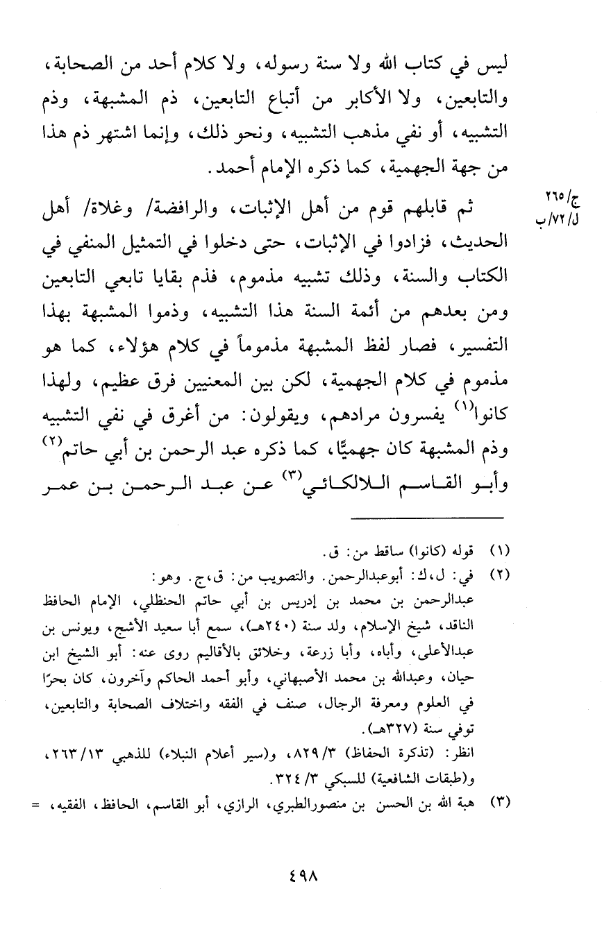 ليس في كتاب الله ولا سنة رسوله ولا كلام أحد من الصحابة والتابعين ولا الأكابر من أتباع التابعين ذم المشبهة وذم التشبيه أو نفي مذهب التشبيه ونحو ذلك وإنما اشتهر ذم هذا من جهة الجهمية كما ذكره الإمام أحمد ثم قابلهم قوم من أهل الإثبات والرافضة وغلاة أهل الحديث فزادوا في الإثبات حتى دخلوا في التمثيل المنفي في الكتاب والسنة وذلك تشبيه مذموم فذم بقايا تابعي التابعين ومن بعدهم من أئمة السنة هذا التشبيه وذموا المشبهة بهذا التفسير فصار لفظ المشبهة مذموماً في كلام هؤلاء كما هو مذموم في كلام الجهمية لكن بين المعنيين فرق عظيم ولهذا كانوا يفسرون مرادهم ويقولون من أغرق في نفي التشبيه وذم المشبهة كان جهميًّا كما ذكره عبد الرحمن بن أبي حاتم وأبو القاسم اللالكائي عن عبد الرحمن بن عمر