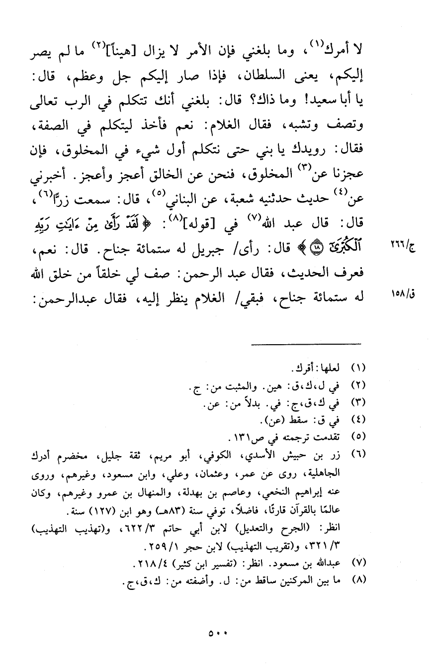 لا أمرك وما بلغني فإن الأمر لا يزال هيناً ما لم يصر إليكم يعني السلطان فإذا صار إليكم جل وعظم قال يا أبا سعيد وما ذاك قال بلغني أنك تتكلم في الرب تعالى وتصف وتشبه فقال الغلام نعم فأخذ ليتكلم في الصفة فقال رويدك يا بني حتى نتكلم أول شيء في المخلوق فإن عجزنا عن المخلوق فنحن عن الخالق أعجز وأعجز أخبرني عن حديث حدثنيه شعبة عن البناني قال سمعت زرًّا قال قال عبد الله في قوله لَقَدْ رَأَى مِنْ آيَاتِ رَبِّهِ الْكُبْرَى (18) قال رأى جبريل له ستمائة جناح قال نعم فعرف الحديث فقال عبد الرحمن صف لي خلقاً من خلق الله له ستمائة جناح فبقي الغلام ينظر إليه فقال عبد الرحمن