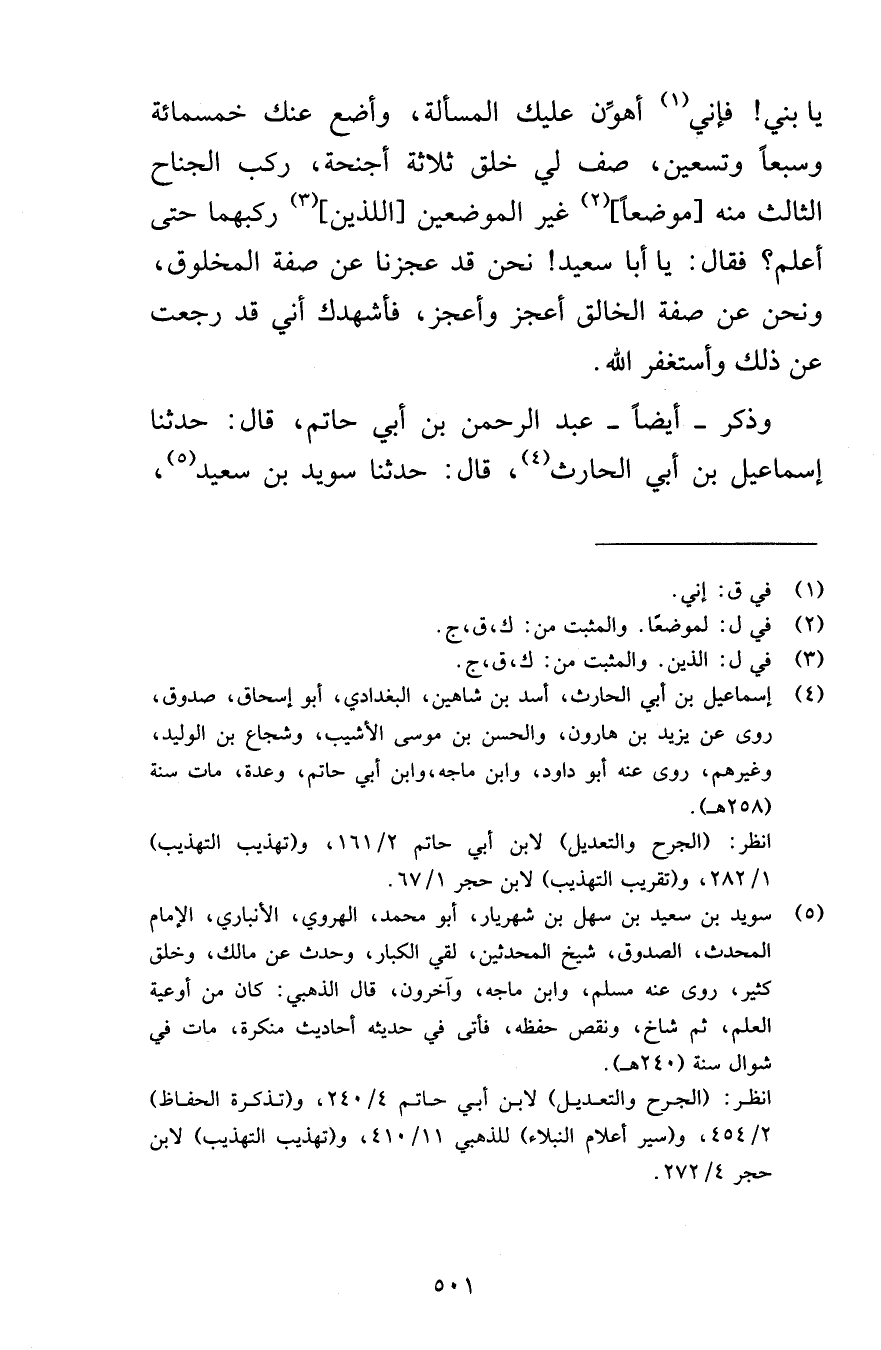يا بني فإني أهوِّن عليك المسألة وأضع عنك خمسمائة وسبعاً وتسعين صف لي خلق ثلاثة أجنحة ركب الجناح الثلث منه موضعاً غير الموضعين اللذين ركبهما حتى أعلم فقال يا أبا سعيد نحن قد عجزنا عن صفة المخلوق ونحن عن صفة الخالق أعجز وأعجز فأشهدك أني قد رجعت عن ذلك وأستغفر الله وذكر أيضاً عبد الرحمن بن أبي حاتم قال حدثنا إسماعيل بن أبي الحارث قال حدثنا سويد بن سعيد
