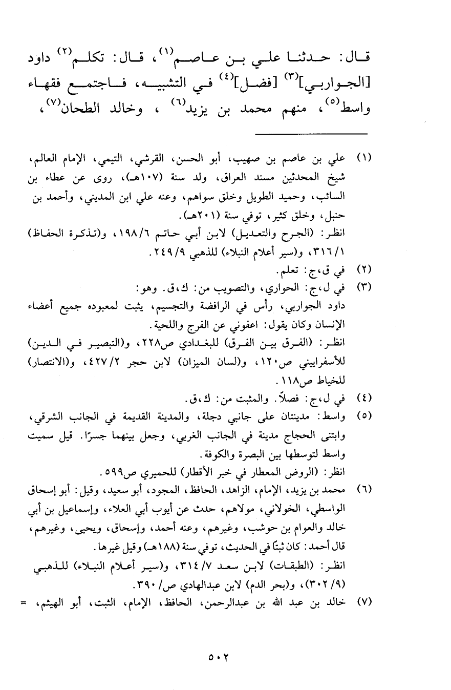 قال حدثنا علي بن عاصم قال تكلم داود الجواربي فضل في التشبيه فاجتمع فقهاء واسط منهم محمد بن زيد وخالد الطحان