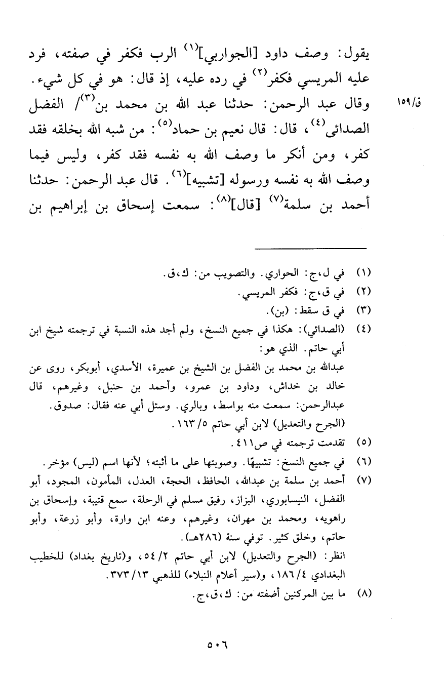 يقول وصف داود الجواربي الرب فكفر في صفته فرد عليه المريسي فكفر في رده عليه إذ قال هو في كل شيء وقال عبد الرحمن حدثنا عبد الله بن محمد بن الفضل الصدائى قال قال نعيم بن حماد من شبه الله بخلقه فقد كفر ومن انك ما وصف الله به نفسه فقد كفر وليس فيما وصف الله به نفسه ورسوله تشبيه قال عبد الرحمن حدثنا أحمد بن سلمة قال سمعت إسحاق بن إبراهيم بن
