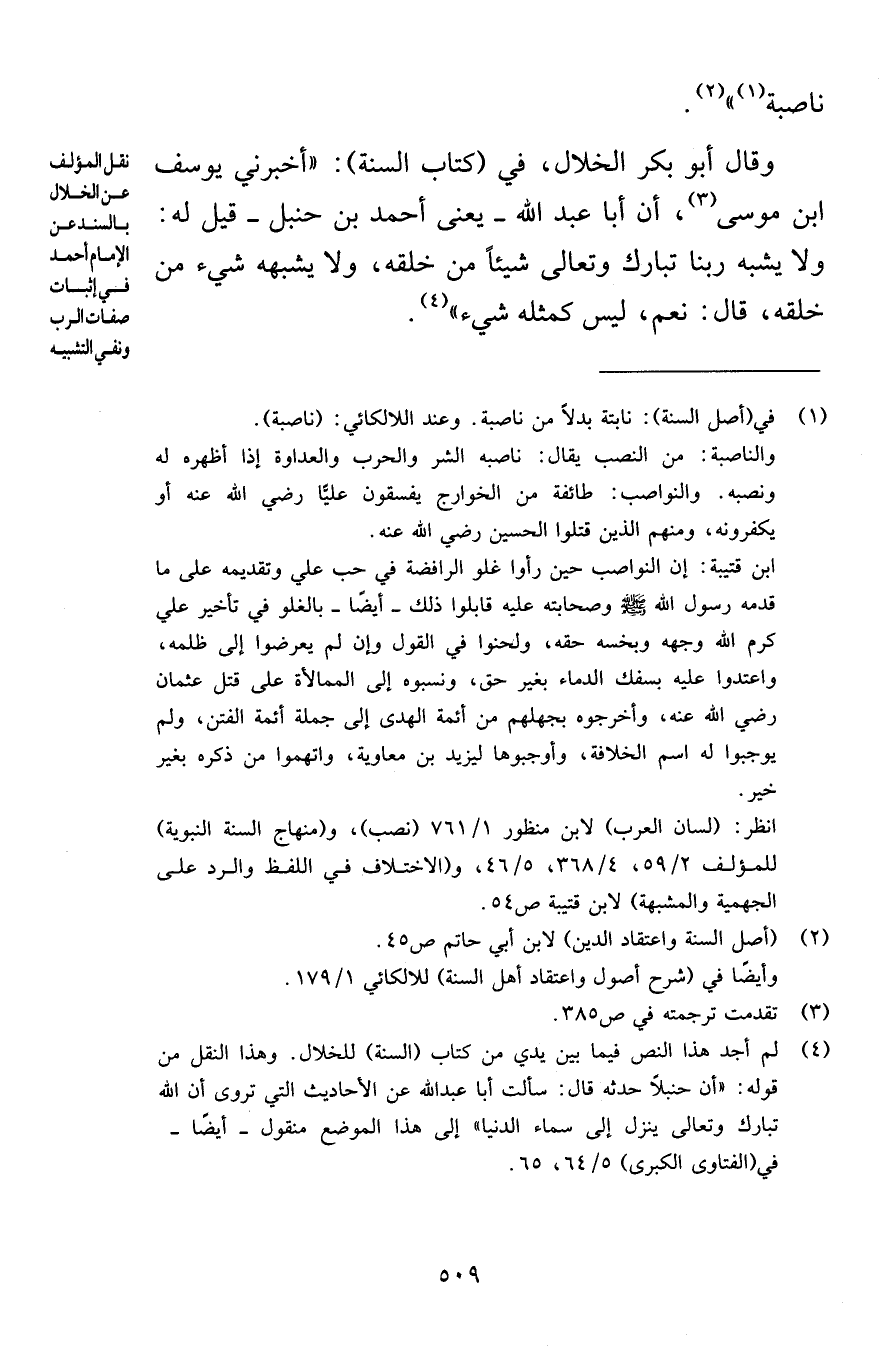 ناصبة وقال أبو بكر الخلال في كتاب السنة أخبرني يوسف ابن موسى أن أبا عبد الله يعني أحمد بن حنبل قيل له ولا يشبه ربنا تبارك وتعالى شيئاً من خلقه ولا يشبهه شيء من خلقه قال نعم وليس كمثله شيء