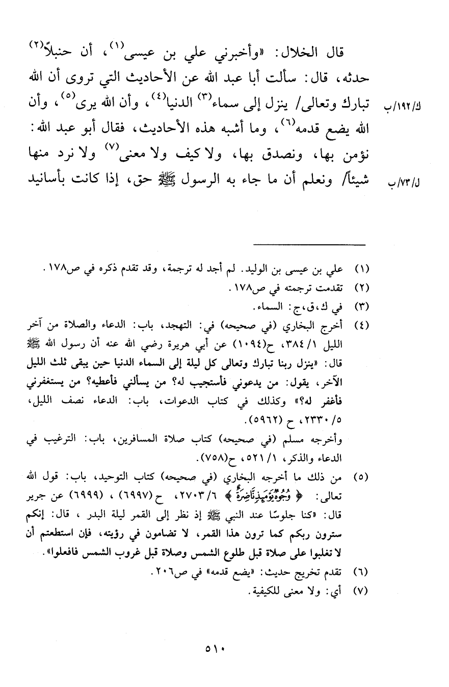 قال الخلال وأخبرني علي بن عيسى أن حنبلاً حدثه قال سألت أبا عبد الله عن الأحاديث التي تروى أن الله تبارك وتعالى ينزل إلى سماء الدنيا وأن الله يرى وأن الله يضع قدمه وما أشبه هذه الأحاديث فقال أبو عبد الله نؤمن بها ونصدق بها ولا كيف ولا معنى ولا نرد منها شيئاً ونعلم أن ما جاء به الرسول صلى الله عليه وسلم حق إذا كانت بأسانيد