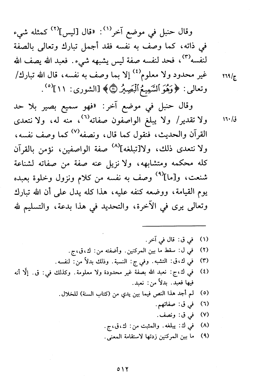 وقال حنبل في موضع آخر قال ليس كمثله شيء في ذاته كما وصف به نفسه فقد أجمل تبارك وتعالى بالصفة لنفسه فحد لنفسه صفة ليس يشبهه شيء فعبد الله يصف الله غير محدود ولا معلوم إلا بما وصف به نفسه قال الله تبارك وتعالى وَهُوَ السَّمِيعُ الْبَصِيرُ (11) [الشورى 11] وقال حنبل في موضع آخر فهو سميع بصير بلا حد ولا تقدير ولا يبلغ الواصفون صفاته منه له ولا نتعدى القرآن والحديث فنقول كما قال ونصفه كما وصف نفسه ولا نتعدى ذلك ولا تبلغه صفة الواصفين نؤمن بالقرآن كله محكمه ومتشابهه ولا نزيل عنه صفة من صفاته لشناعة شنعت وما وصف به نفسه من كلام ونزول وخلوة بعبده يوم القيامة ووضعه كنفه عليه هذا كله يدل على أن الله تبارك وتعالى يرى في الآخرة والتحديد في هذا بدعة والتسليم لله